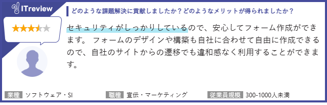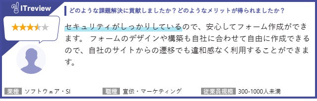 このたび頂戴したユーザーコメントでは、「セキュリティがしっかりしているので、安心してフォーム作成ができます」、「簡単に入力ページから確認ページ、送信ページまで作成でき効率が良い」、「単純なものであれば1時間もあれば完成してしまう」など、セキュリティ面での信頼性、入力から送信までをスムーズに構築できる操作性、短時間で仕上げられるスピード感の三点において高いご評価をいただきました。