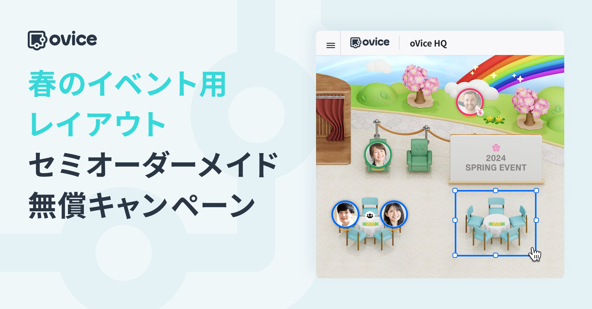 oVice株式会社(本社:石川県七尾市、代表取締役CEO:ジョン・セーヒョン)は、誰もが、どこからでも“つながる”バーチャルオフィス「ovice(オヴィス)」で使える春のイベント用レイアウトのセミオーダーメイドを限定15社に無償で提供する「春のレイアウトセミオーダーメイド無償キャンペーン」を2024年3月11日(月)〜4月10日(水)の1ヶ月間にわたり開催します。
