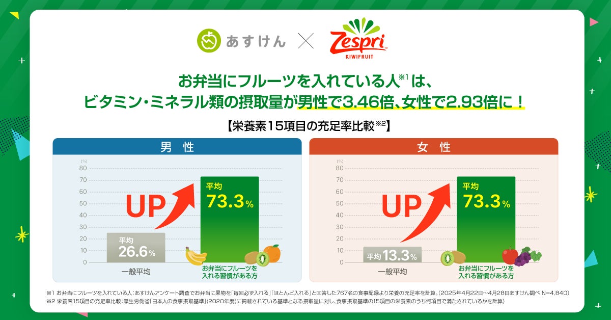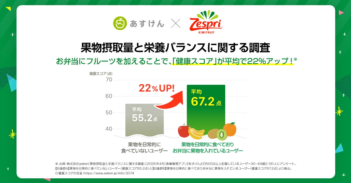 あすけん×ゼスプリ、栄養の日(8月4日)から”キウイで手軽に栄養チャージ”を提案!~【調査結果】お弁当にフルーツを加えるだけで“健康スコア”が22%アップ~