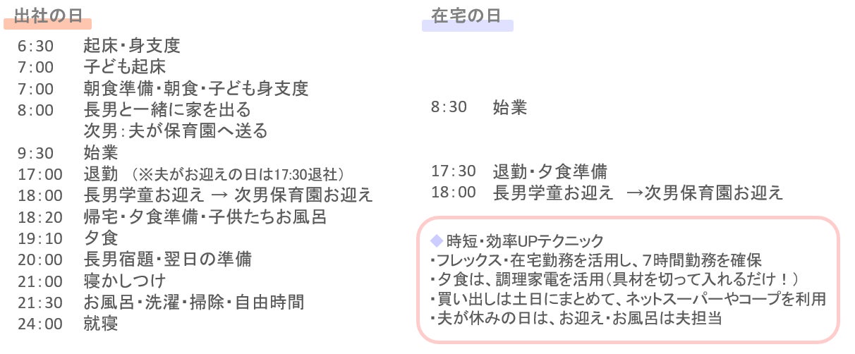 ・時短勤務制度:子どもが小学校3年生まで利用可能(6~7.5時間勤務を選択)