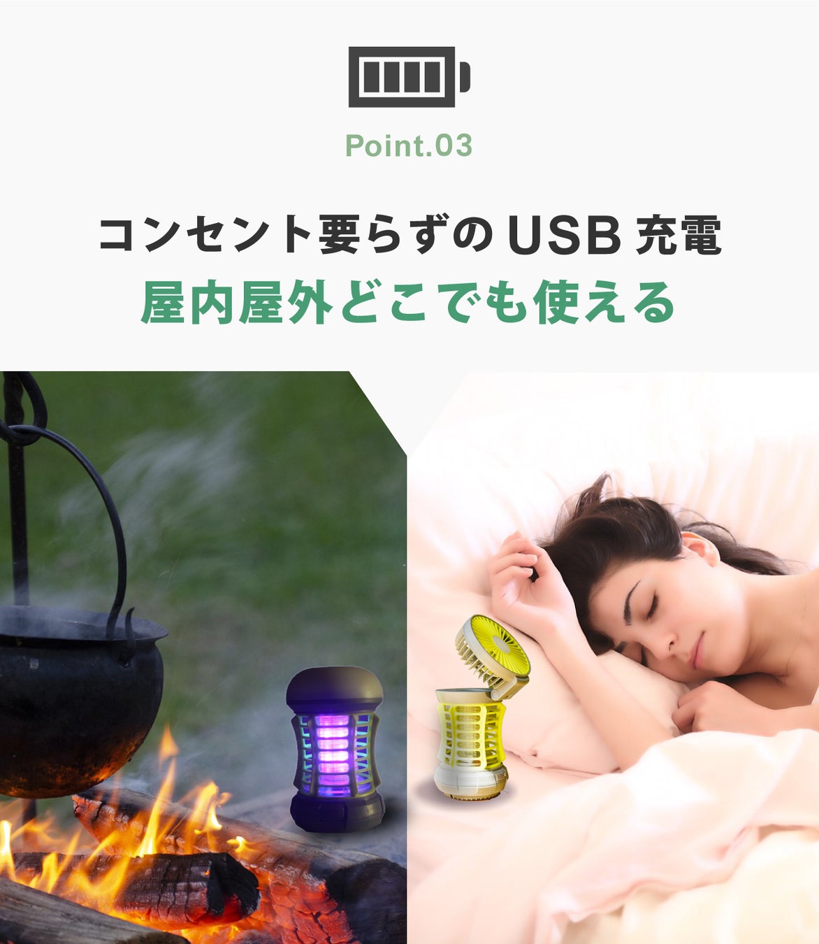 USB充電なので、キャンプなどでの使用時もモバイルバッテリーから簡単に充電できます。