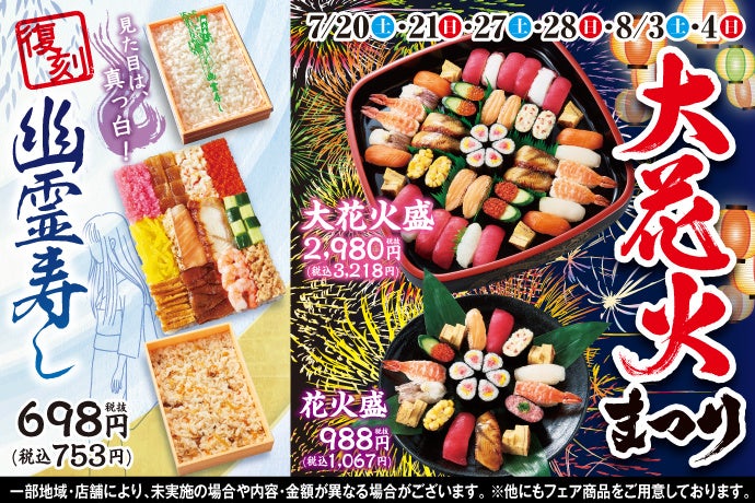 KOZOホールディングス株式会社の子会社である株式会社小僧寿しは、持ち帰りすし店「小僧寿し」にて、7月20日(土)~21日(日)・7月27日(土)~28日(日)・8月3日(土)~4日(日)の期間限定で『大花火まつり&幽霊寿し』を開催します。