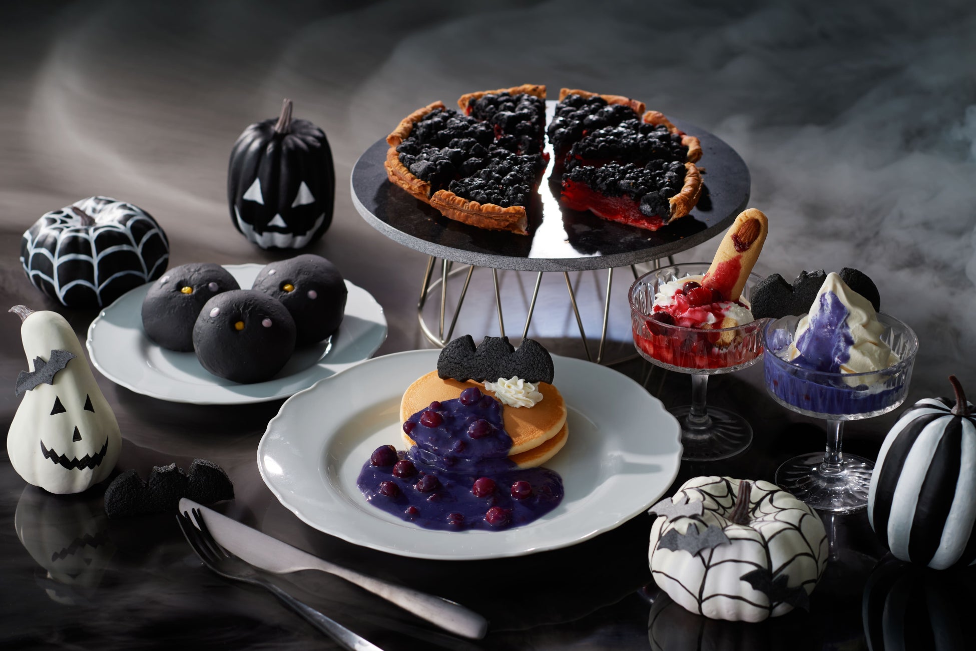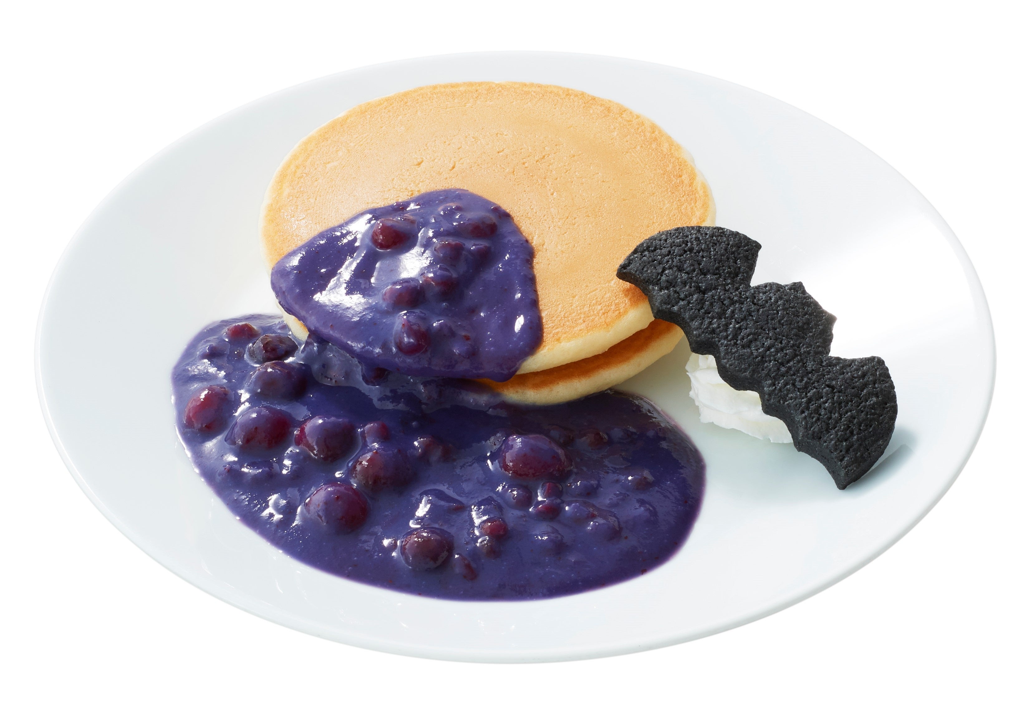 ハロウィン気分を盛り上げる、紫色のソースたっぷりの魔女のベリーパンケーキ?!さらに、大人気ひよこパンがおばけになって登場!