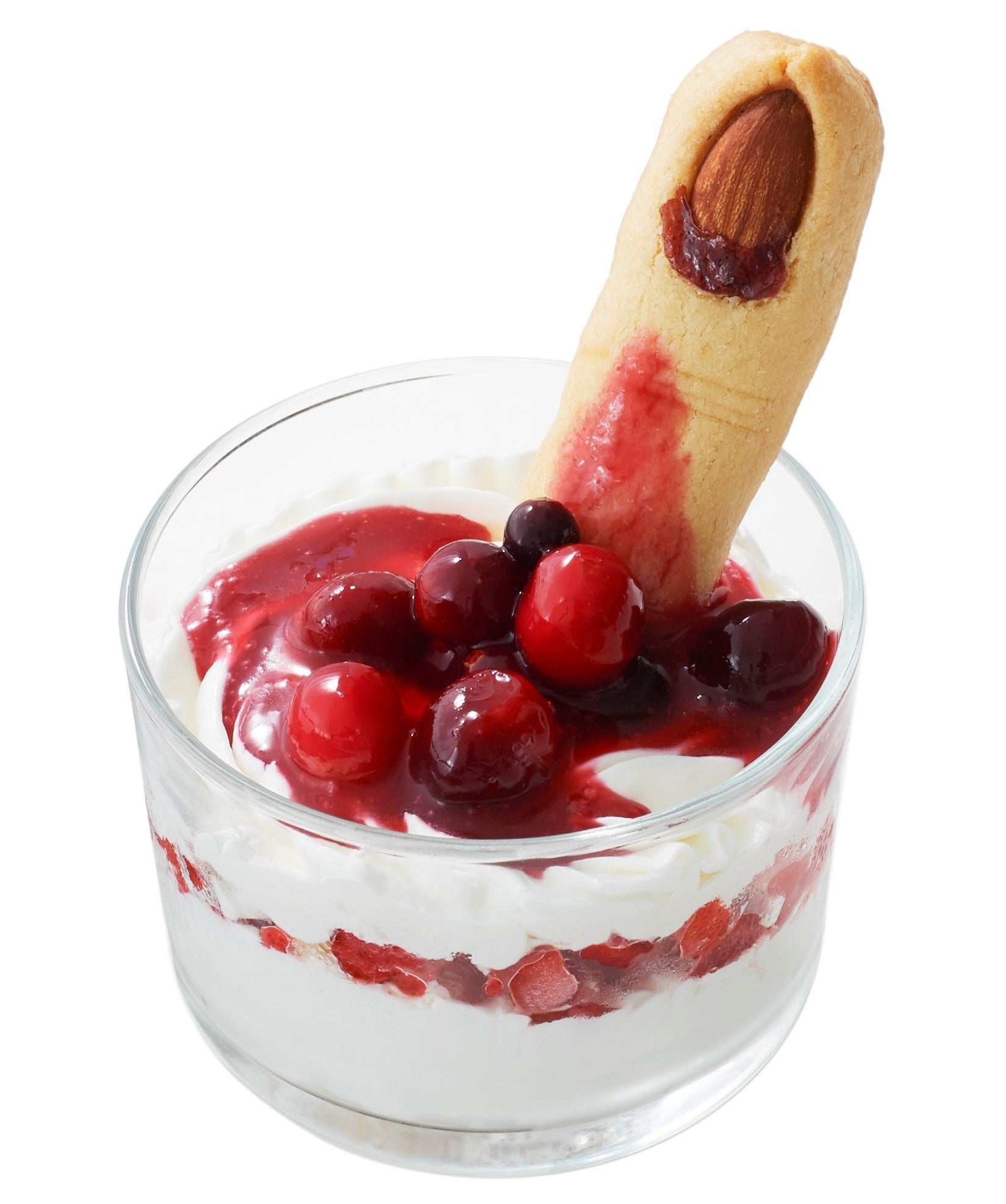 赤いベリーソースをかけたパフェに、指の形のクッキーを添えたちょっぴり怖い一品。