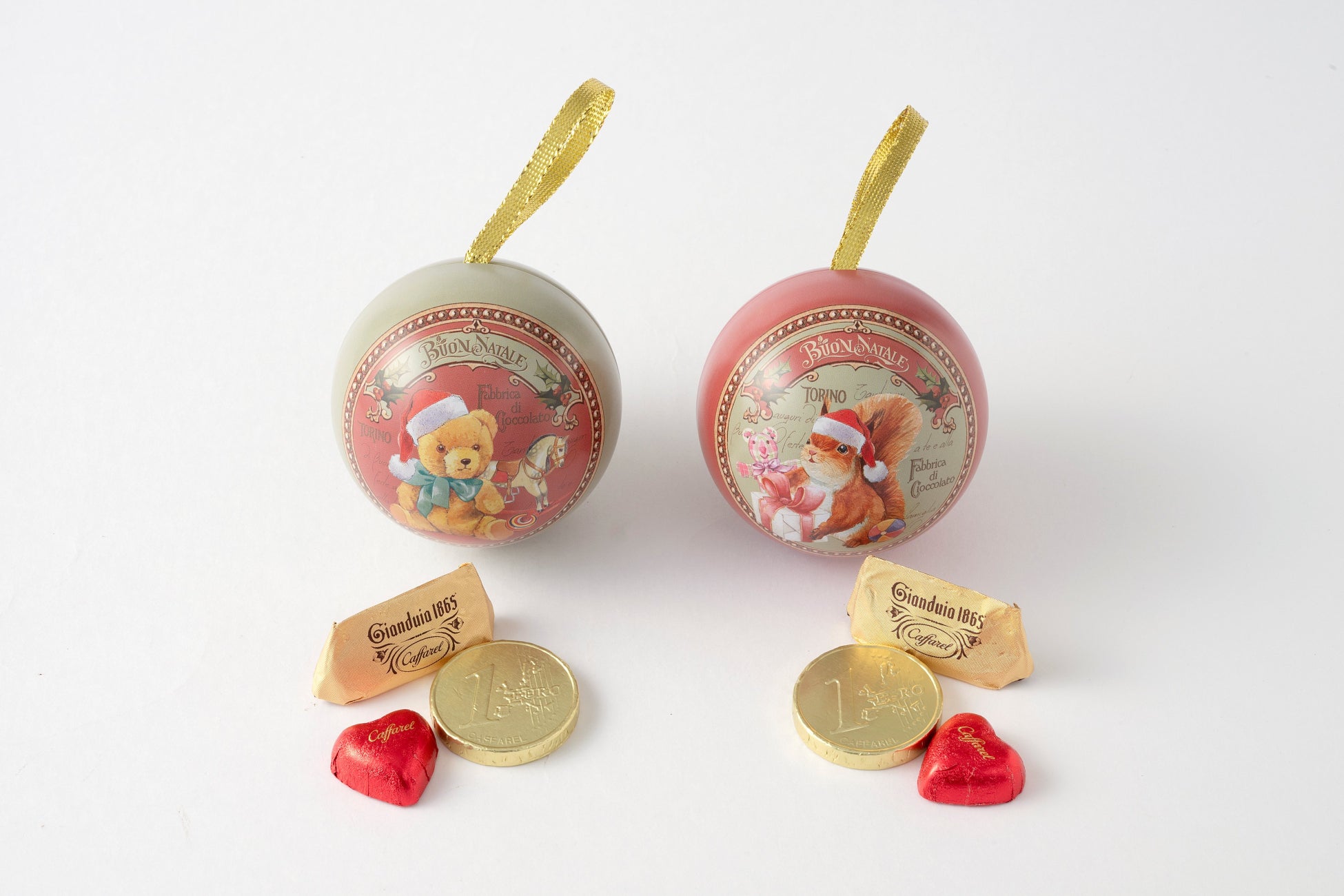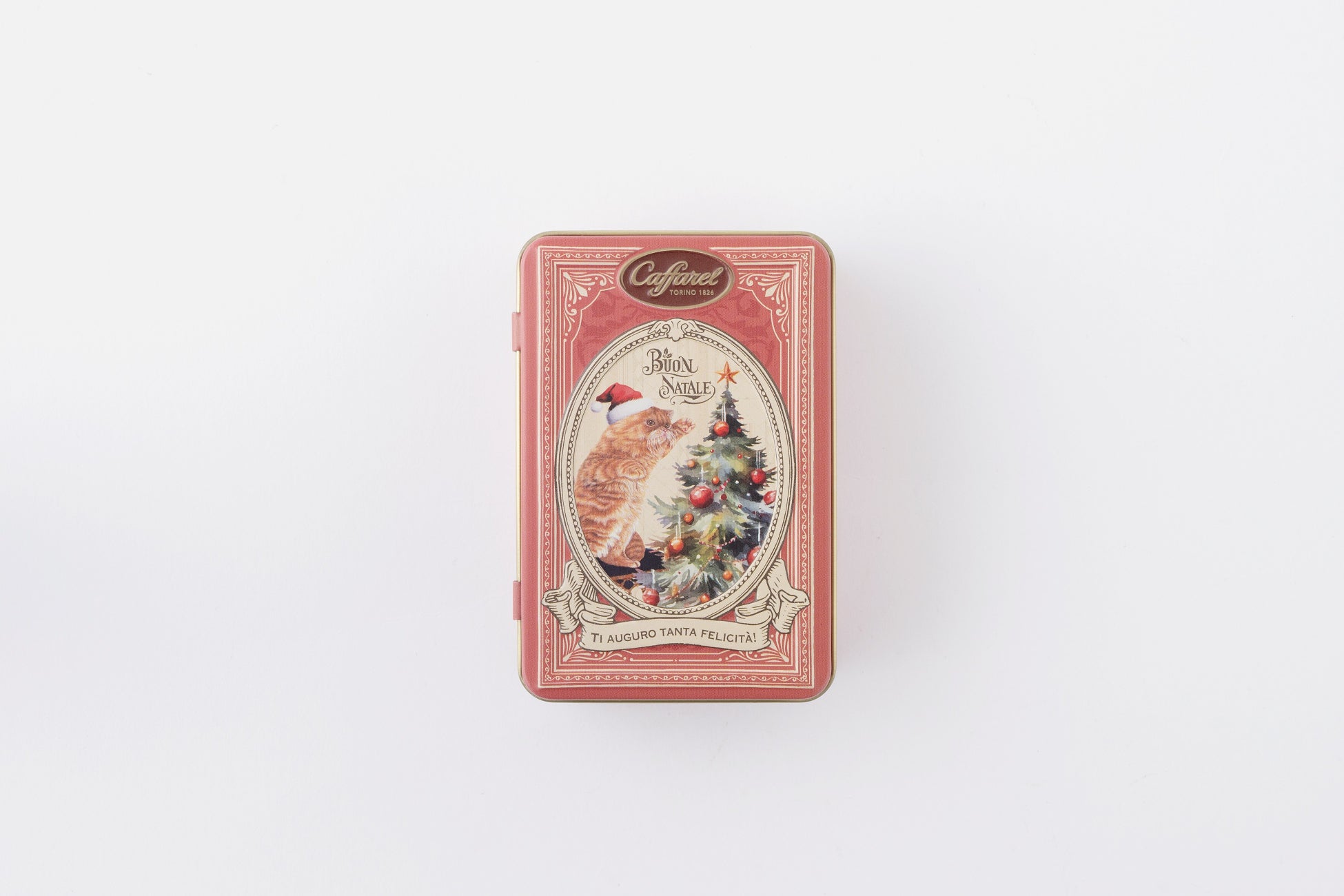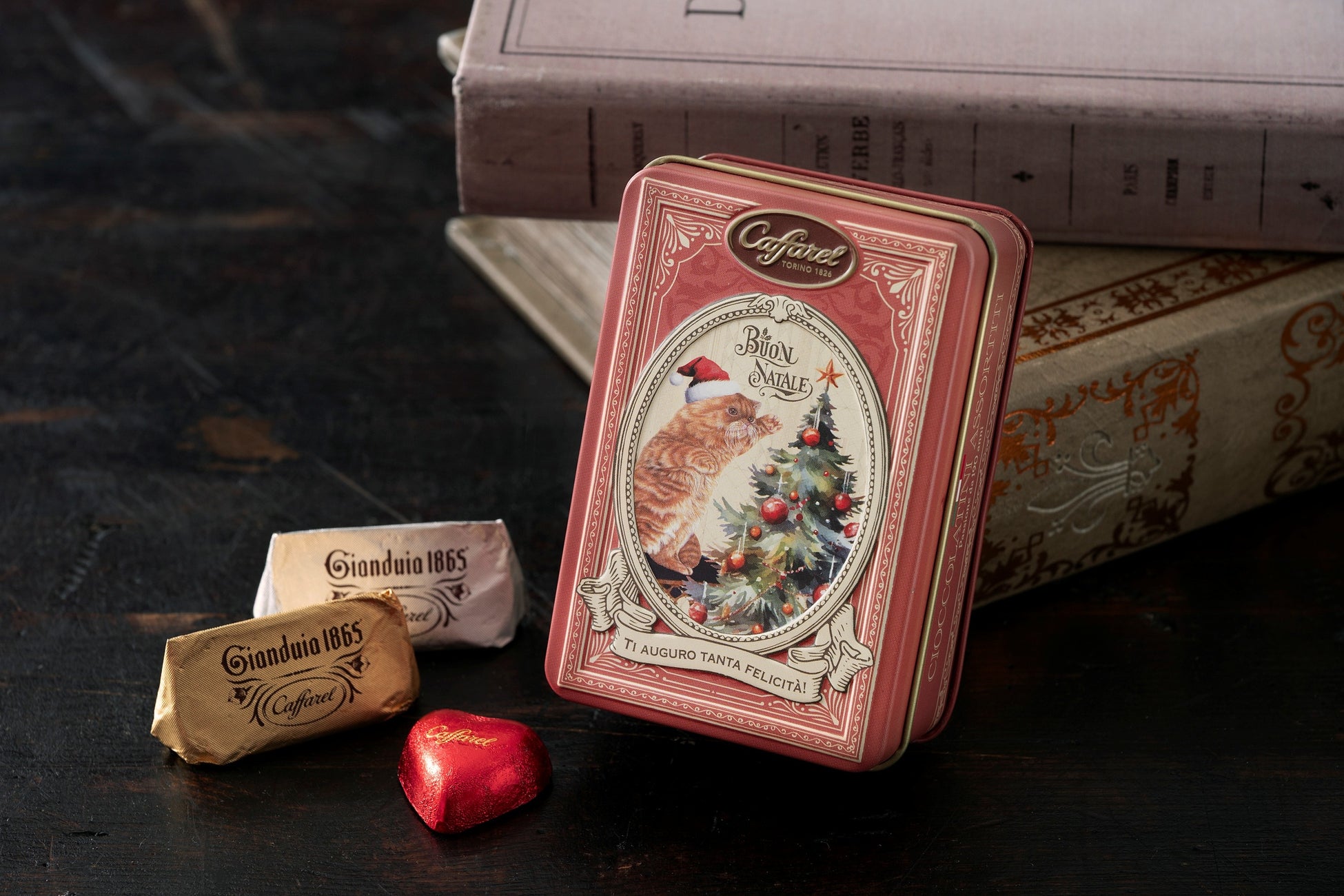詳細: クリスマスのプチギフトにもおすすめの蝶番缶です。イタリア語で「あなたに幸せを祈っています」というメッセージと可愛い猫がクリスマスツリーを飾りつけしているほほえましいシーンが目を惹くデザイン。蓋はエンボス加工されており、高級感もあります。サンタクロースのホイルで包まれたバッポナターレ、定番のジャンドゥーヤ、ハートとユーロコイン型のチョコレート合計5粒アソート。