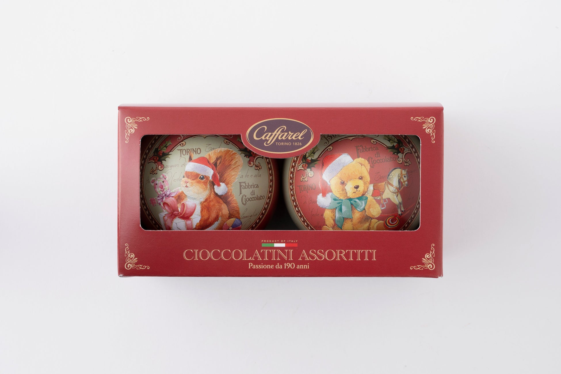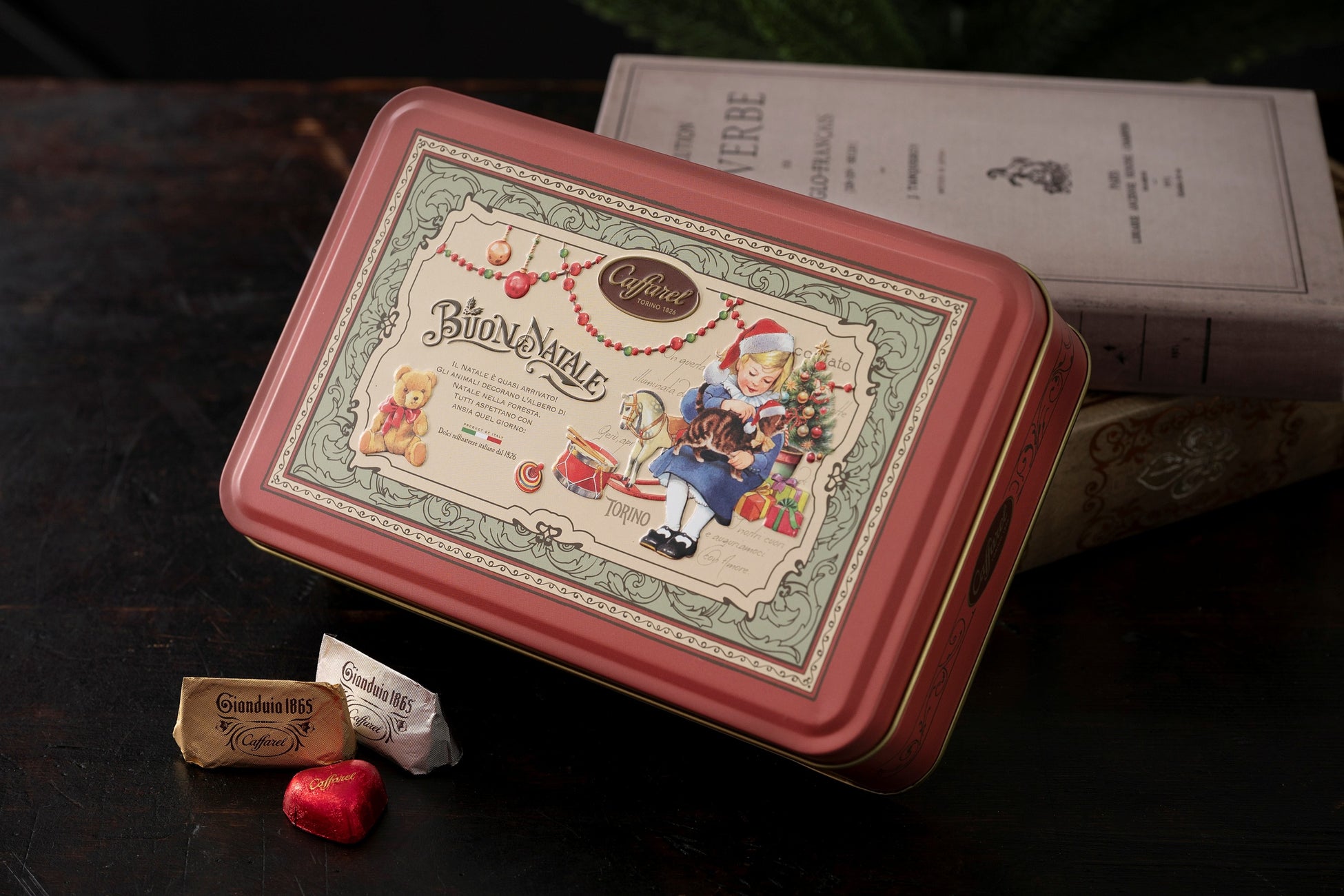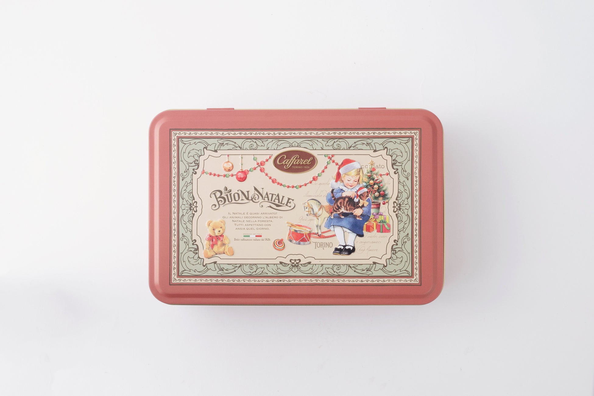 詳細:クラシカルなエンジ色にクリスマスプレゼントに囲まれた女の子が猫と戯れるシーンがデザインされた蝶番缶。イタリア語で「クリスマスがやってきました。動物たちが森のクリスマスツリーを飾っています。皆がその日を待ち望んでいます」というメッセージが入っております。中にはカファレルの代名詞であるジャンドゥーヤや人気のピエモンテに加え、キャットやきのこ、てんとう虫のホイルチョコレート、ミニハートのホイルチョコレートなど合計20粒アソート。