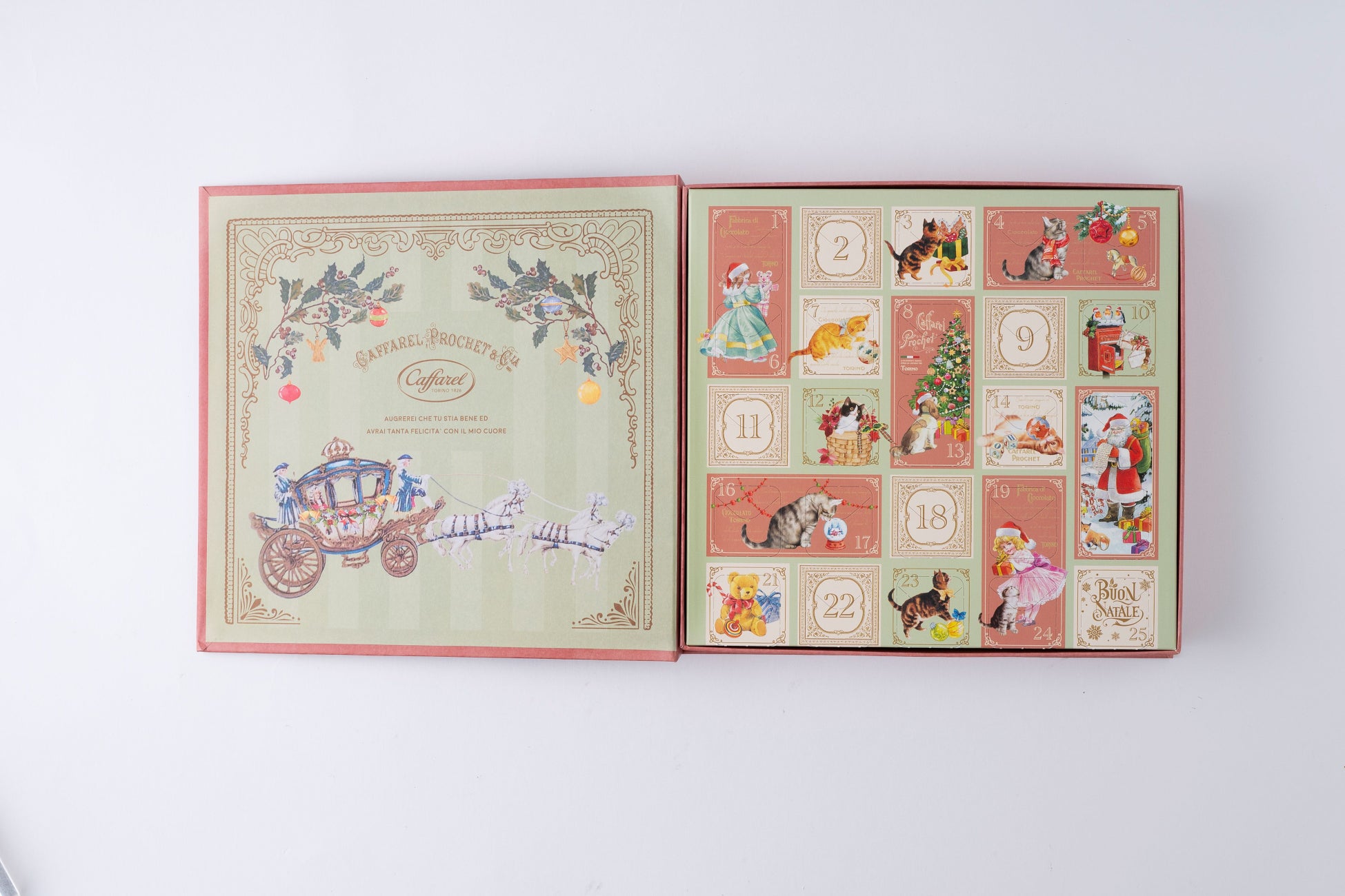 詳細:毎年人気のカレンダー。今年はアンティークな絵本をイメージにしたブック型。描かれているカファレルの動物や女の子達のイラストがそれぞれの世界に飛び出し、カファレルのクリスマスコレクションを盛り上げます。ブックの扉を開けると、華やかな馬車のイラストが楽しいクリスマスパーティへと誘います。カウントダウンページには、クリスマスを待ちわびるカファレルの仲間たちが描かれ、中にはカファレルを代表するジャンドゥーヤをはじめ、サンタやキノコ、キャットのホイルチョコレートなど、人気のチョコレートが全25粒アソート。クリスマス気分を盛り上げてくれるオススメのチョコレートブックです。