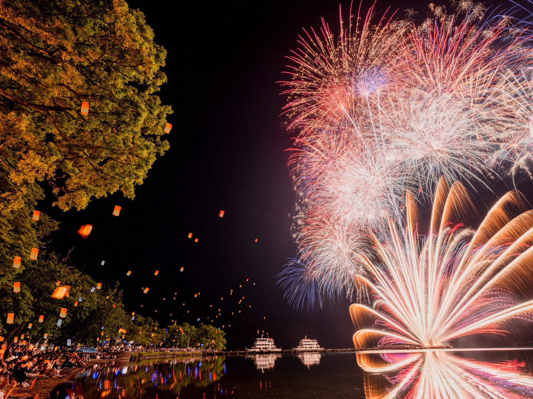 湖上からバルーンランタンと花火を眺めて、幻想的な光景を楽しむことができる約50分間の夜航。