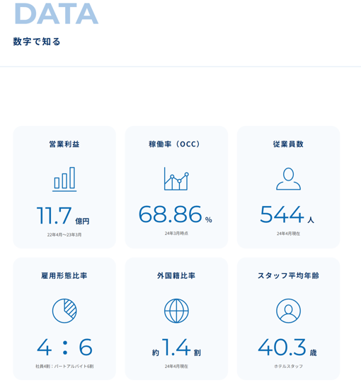 求職者の方に当社のサービスや事業の特⻑を容易にご理解いただけるよう、視覚的にもわかりやすいデータの紹介ページを取り入れました。
