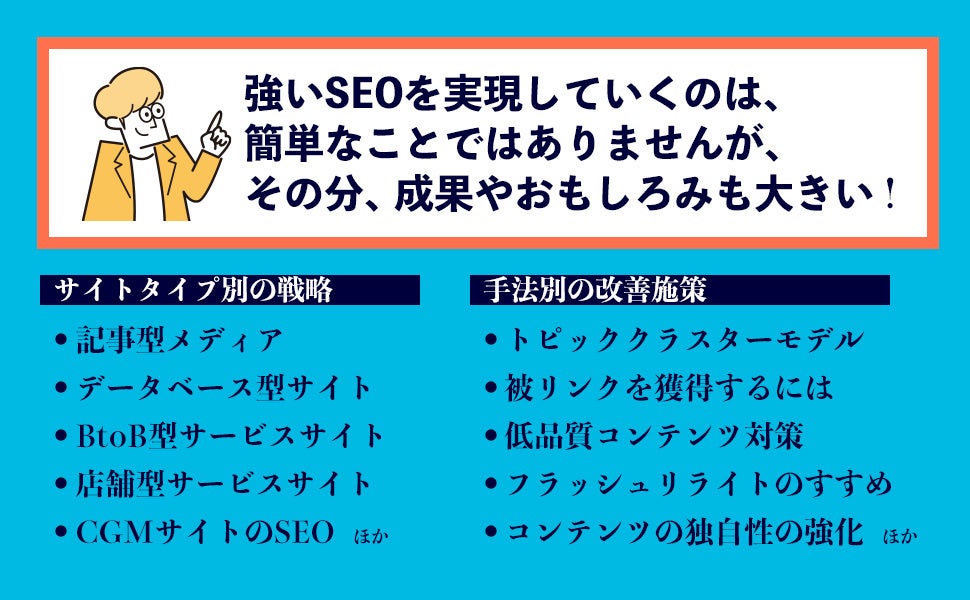 SEOで成果を出す上で重要なマインドや概論はもちろん、サイトタイプ別のSEO戦略や実際に手を動かせるようになる戦術・手法、SEOの地頭を鍛えるための思考法など、現場で必要な情報が盛りだくさんです。
