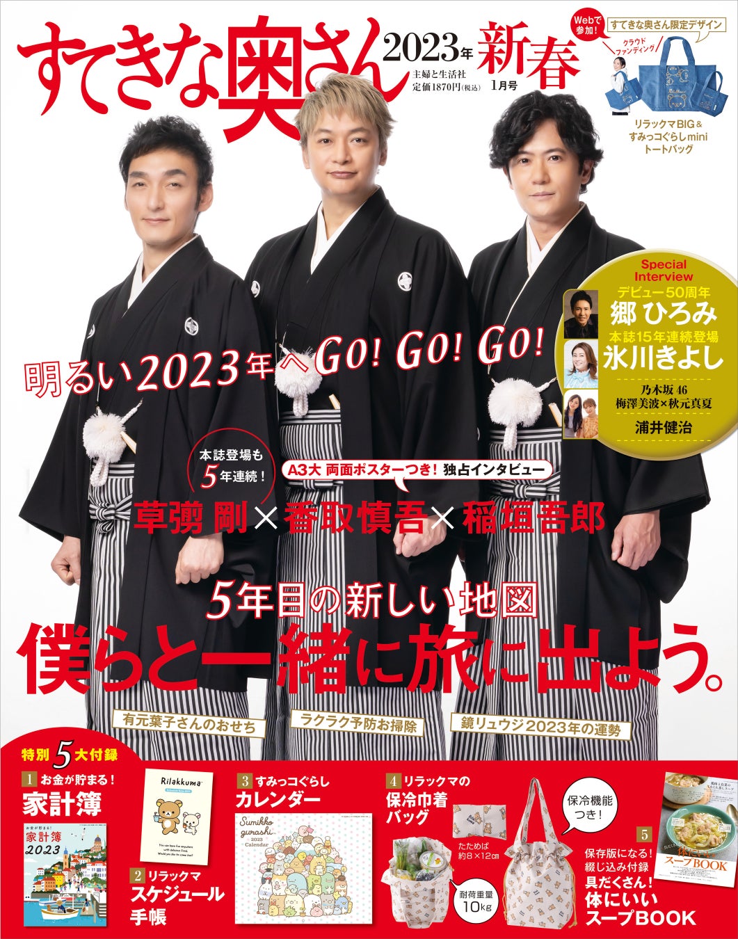 今年で5年目! 国民的スター《稲垣吾郎、草彅 剛、香取慎吾》登場の表紙公開!/『すてきな奥さん2023年新春1月号』11月18日(金)発売予定