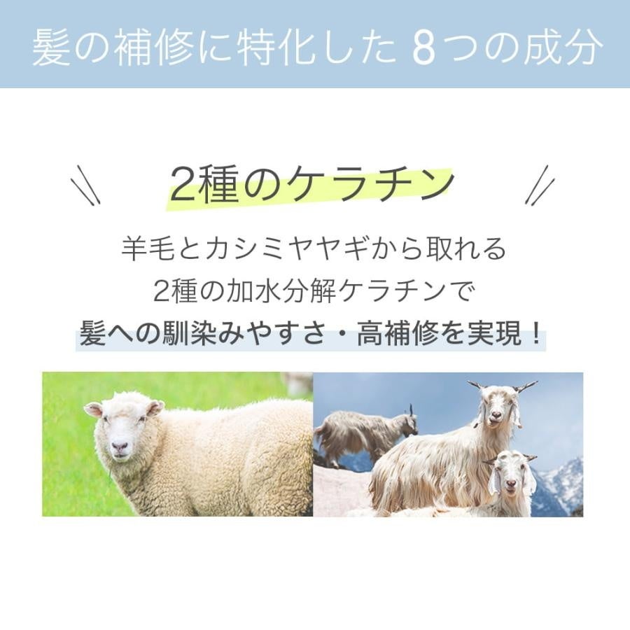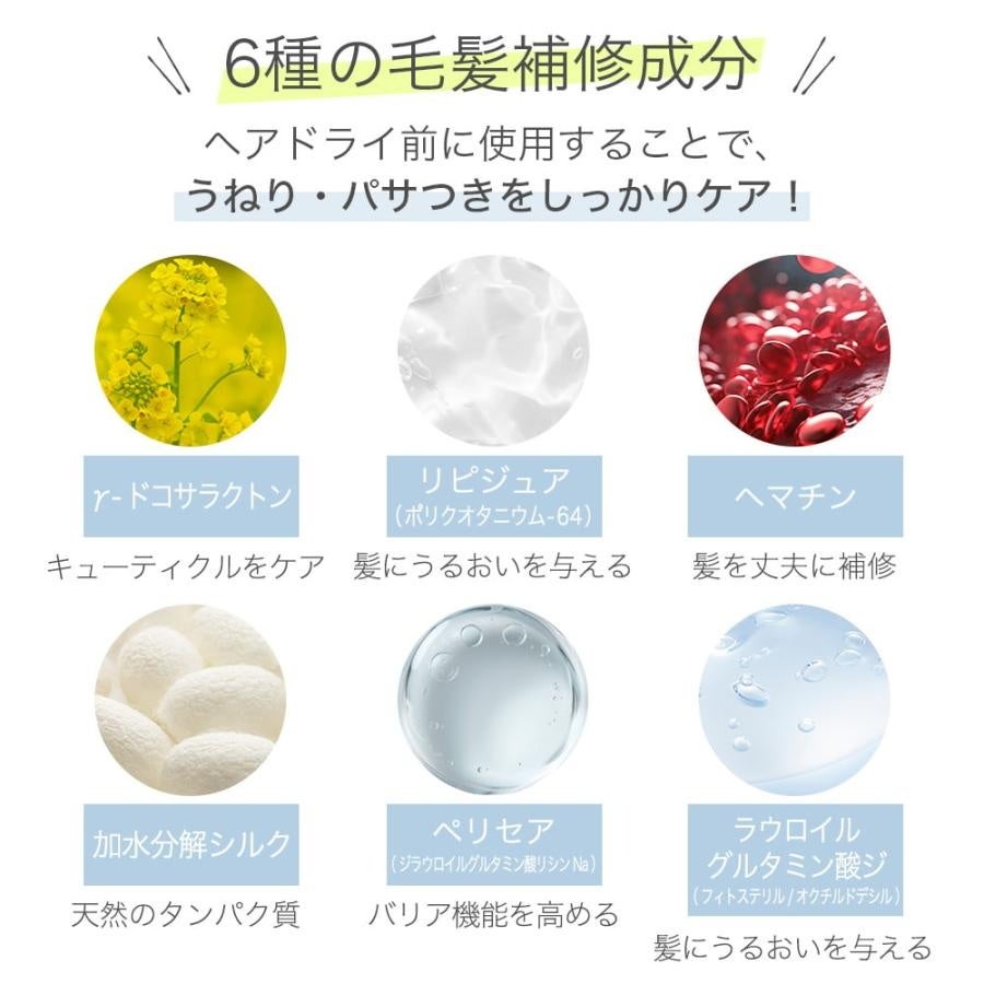 2種のケラチンにより髪への馴染みやすさ、高補修を実現!6種の毛筆補修成分によりうねり、パサつきをケア。