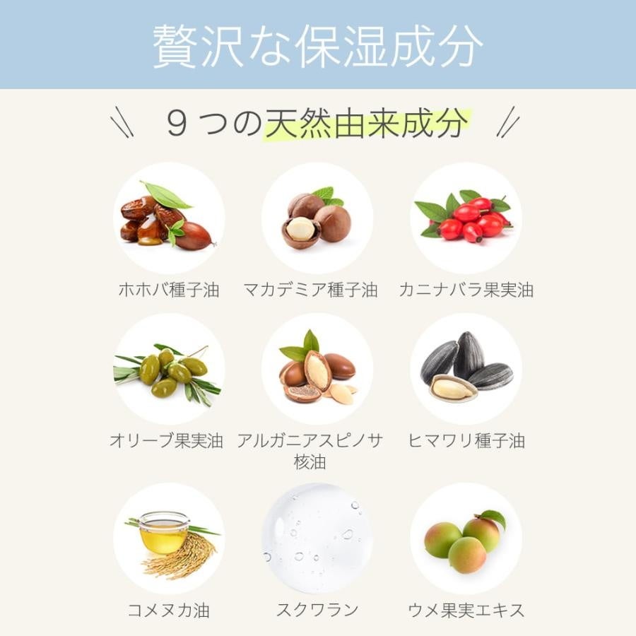 乾燥に効果のあるホホバ種子油、頭皮のべたつきをケアしてくれるマカダミア種子油、髪の毛をツヤツヤにしてくれるオリーブ果実油、髪の毛の水分やキューティクルに効果のあるセラミド配合して健やかな髪の毛へと導きます。