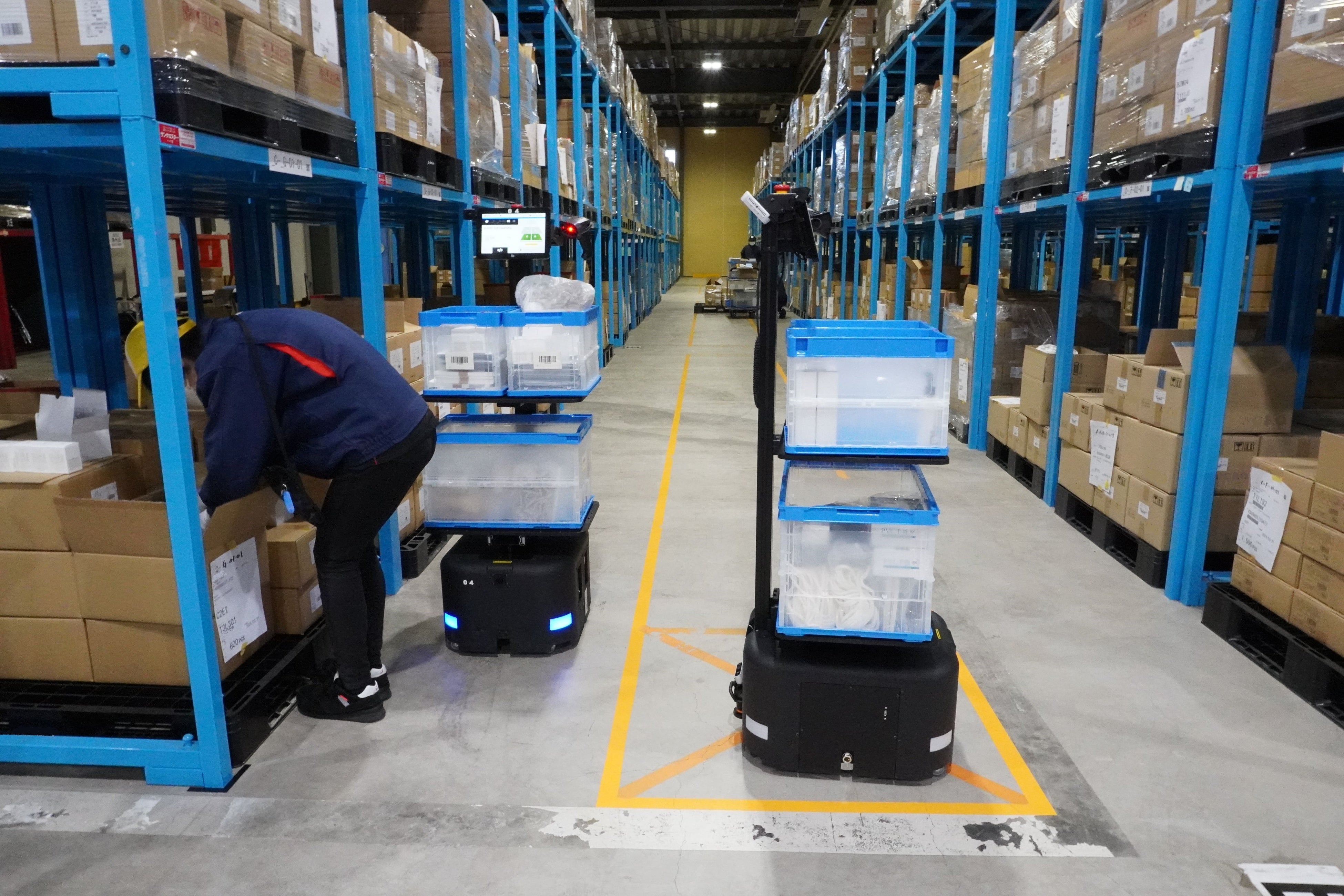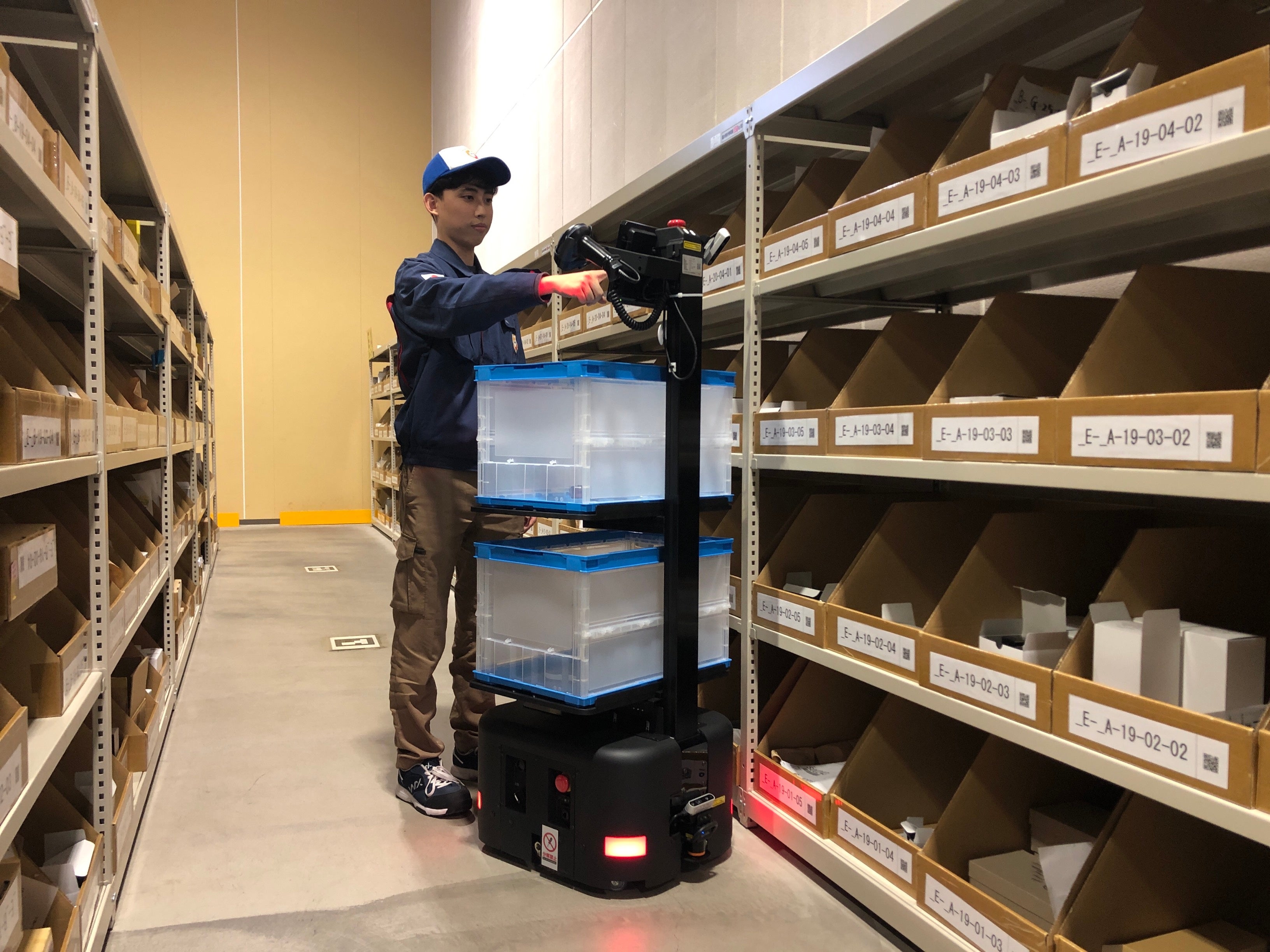 ②作業員は、手ぶらでAMRの場所まで移動し、商品を棚からピックし、AMRに乗せます。