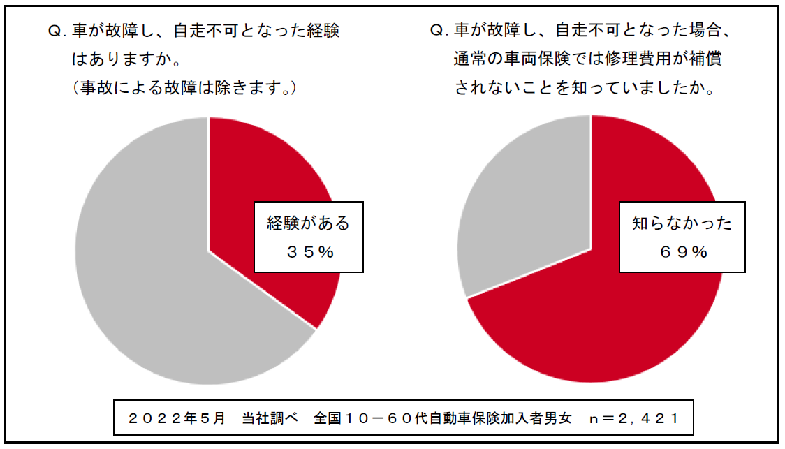当社は、2019年1月に業界で初めて故障の修理費を補償する自動車保険の特約の提供を開始し、発売以降、多くのお客さまにご契約をいただいています。 一方、当社が2022年5月に自動車保険の補償について市場調査を行ったところ、故障は3人に1人(35%)が経験する身近なものにもかかわらず、その修理費が一般的な自動車保険では補償されない※ことを69%の方が知りませんでした。