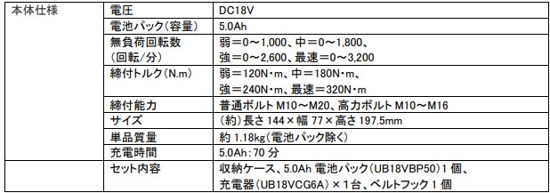 バッテリーの充電器は、5.0A充電池で約70分で充電できる急速タイプ。満充電で高力ボルトM16を約420本締め付けが可能です。