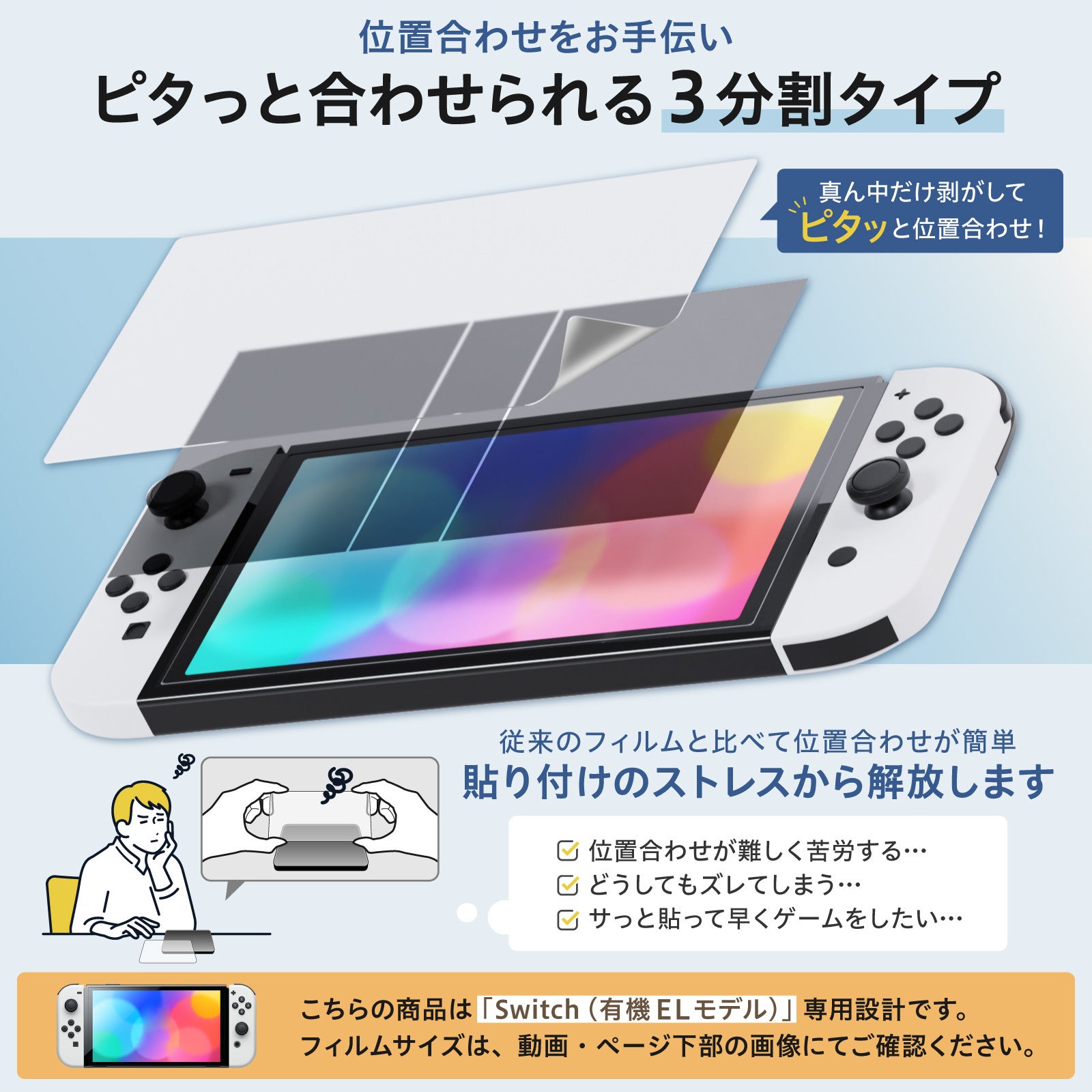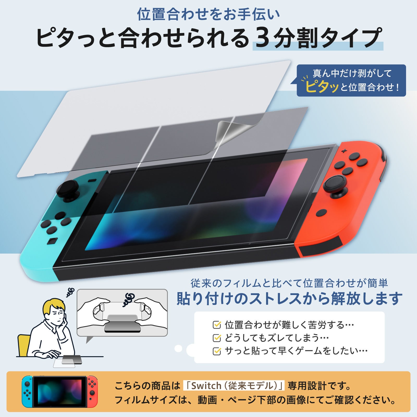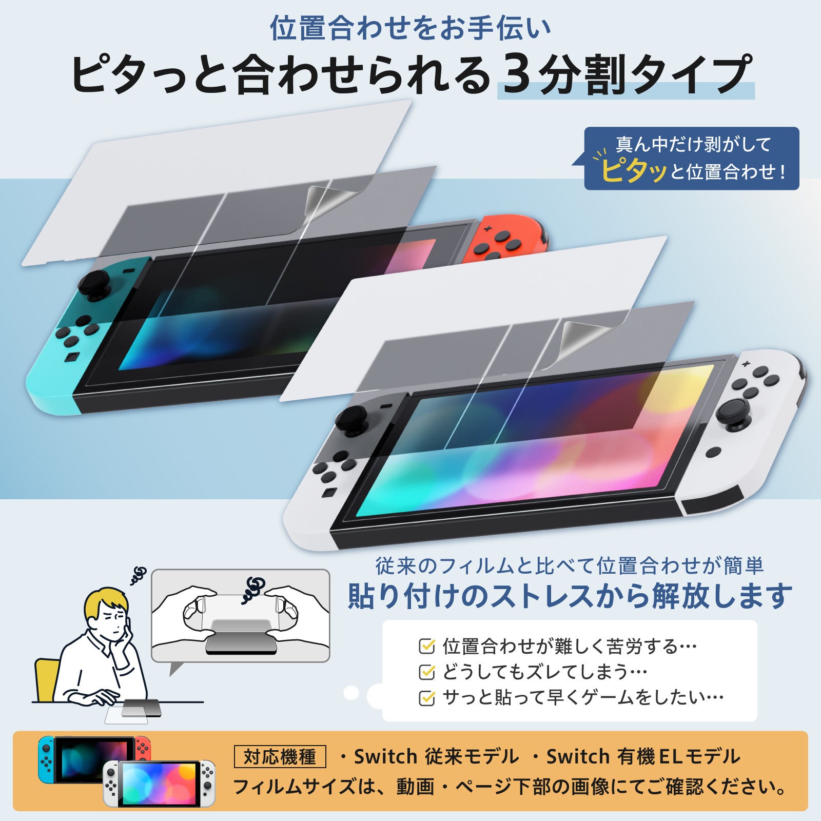 「絶対顔が映り込まない」フィルムを探している方にオススメのスウィッチ用「超反射防止」タイプ。位置合わせがしやすい三分割方式で貼り付けも簡単です。お店での貼り付けサービスは必要ありません!傷防止効果も