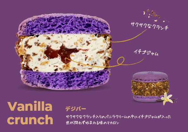 サクサクなクランチ入りのバニラクリームの中にイチゴジャムが入った世代問わず好まれる味のマカロンです。