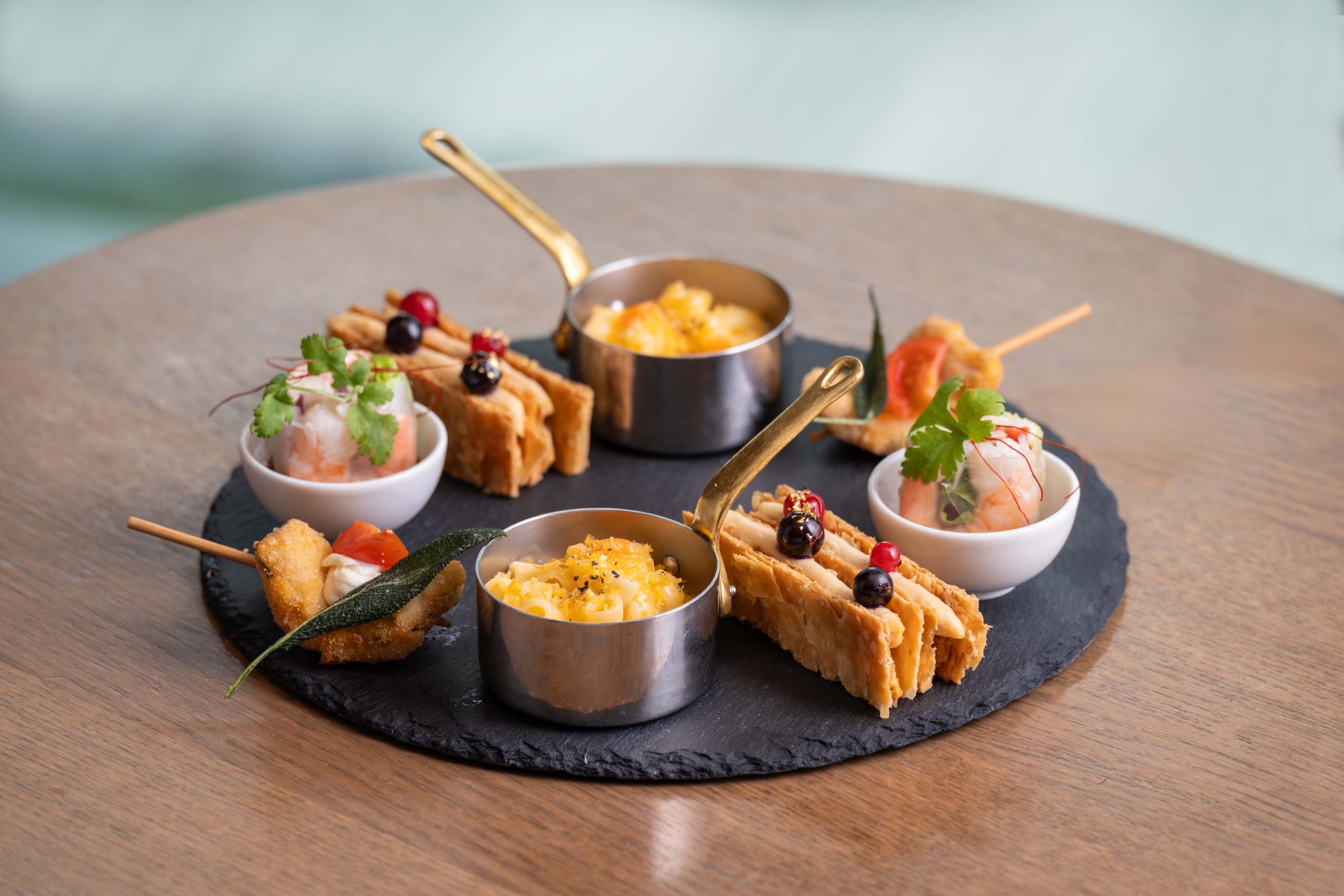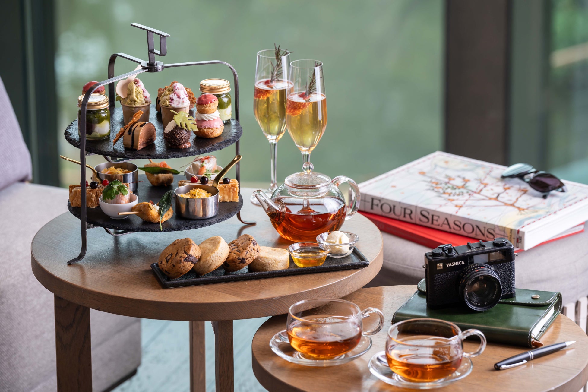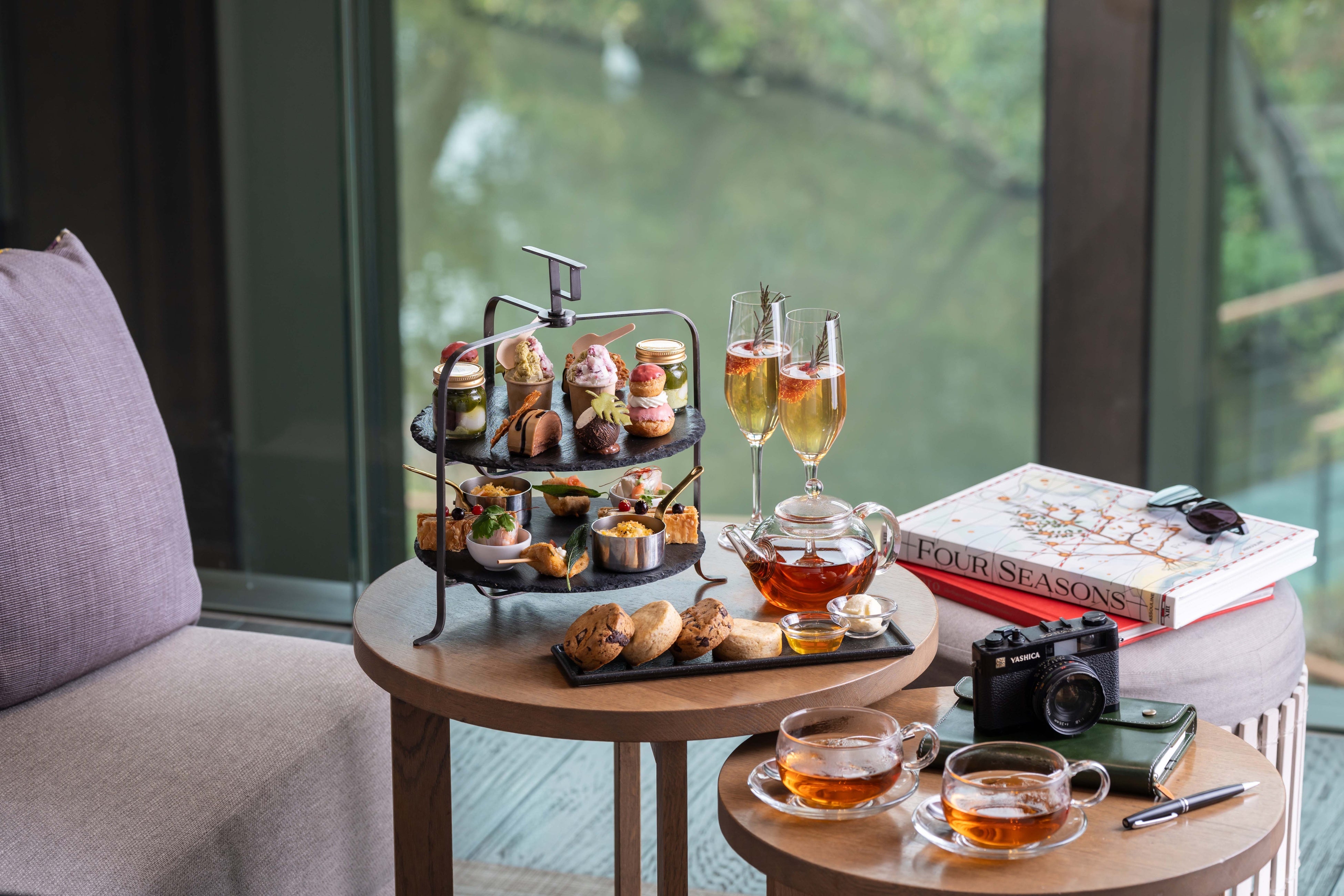 フォーシーズンズのプライベートジェットに乗って世界各地を巡る、この上なくラグジュアリーなツアー旅行「フォーシーズンズ・プライベートジェット・エクスペリエンス」。今回のアフタヌーンティーでは、実際にツアーで訪れる旅先をイメージしたスイーツやセイボリー、ドリンクをご用意し、味覚で世界を旅するラインナップに仕上げました。シアトル、京都、ホイアン、モルディブ、セレンゲティ、マラケシュ、ブタペスト、フィレンツェ、パリといった9つの土地の雰囲気を楽しめる、驚きと新しさに満ちた国際色豊かなアフタヌーンティーです。開放感のある大きな窓から差し込む光と、800年の歴史を誇る日本庭園の新緑を楽しみながら、贅沢な世界旅行に思いを馳せるフォーシーズンズならではのアフタヌーンティーをご体験ください。
