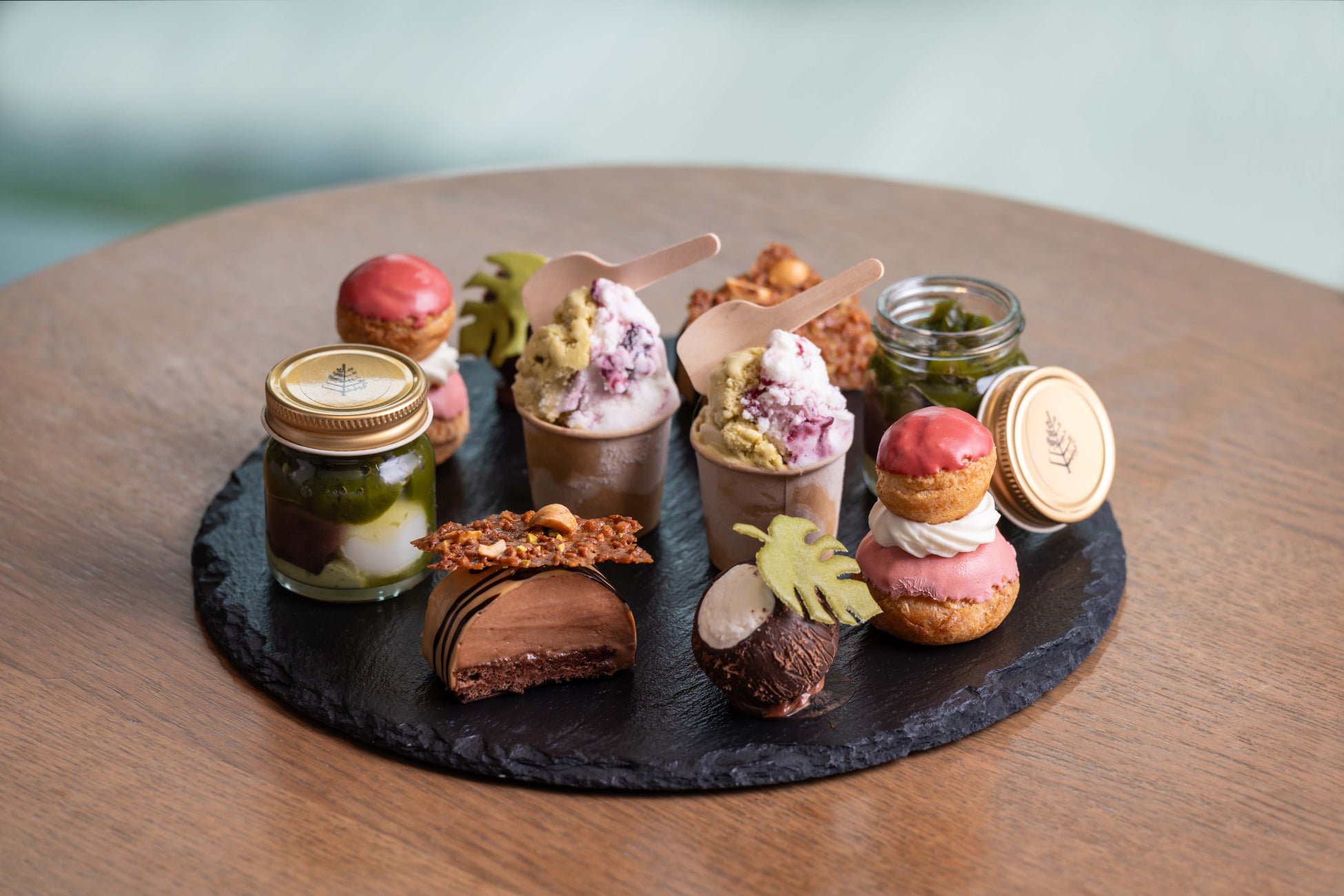 スイーツ5種では、タンザニア産のチョコレートを使い、刻んだナッツをまぶして広々としたセレンゲティの大地を表現した「セレンゲティ タンザニア産チョコレートムース」や、中にラズベリーやストロベリーのカスタードを詰めたパリのクラシックなシュークリーム「パリ ベリールリジューズ」、ココナッツそのものに見立てたリゾート感溢れる「モルディブ ココナッツとトロピカルのムース」など、各地をイメージしたフレーバーをフォーシーズンズホテル京都風にアレンジしています。