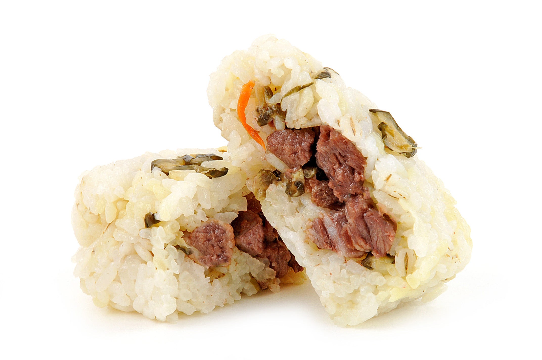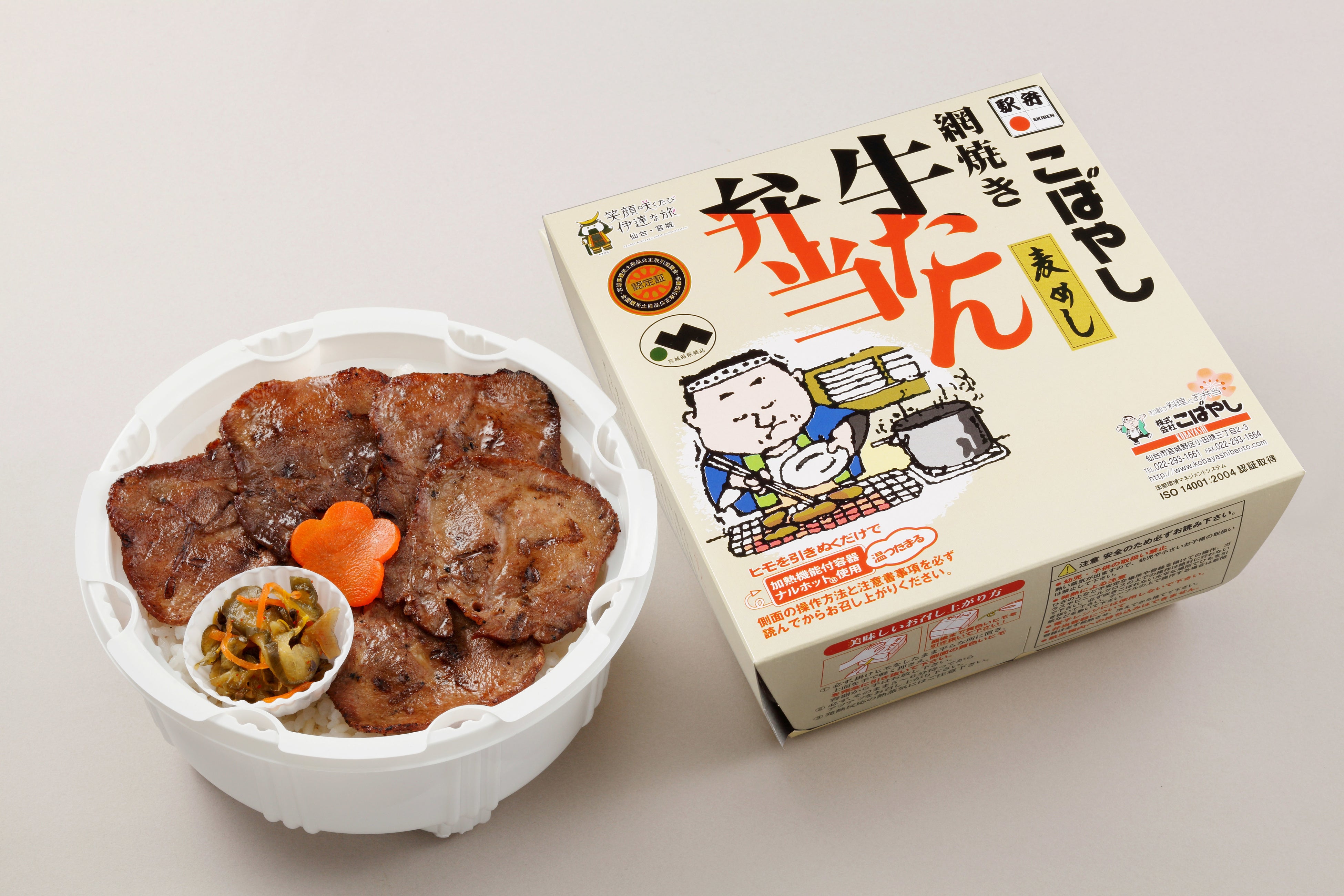 仙台を代表する有名駅弁、こばやしの「牛たん弁当」をおにぎりにしました。こばやしオリジナルの漬物「万来漬け」を混ぜ込んだごはんに、炭火焼風角切り牛タンを詰めてにぎりました。