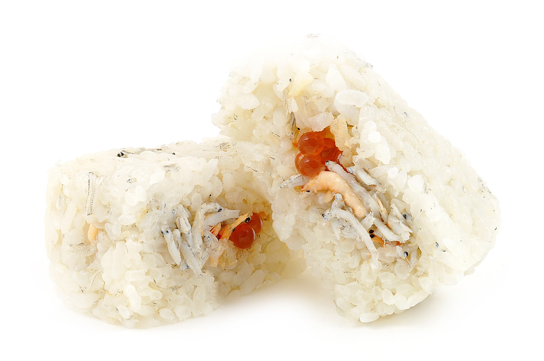 大船軒「しらす弁当」をおにぎりにしました。しらす弁当を食べたときに感じる、『胡麻油香るしらすのふわっと感』が食べ進めると感じられるように、しらすごはんを胡麻油で炊き上げ、更に中具にしらすと桜海老の胡麻油炒りと、いくらをいれてにぎりました。