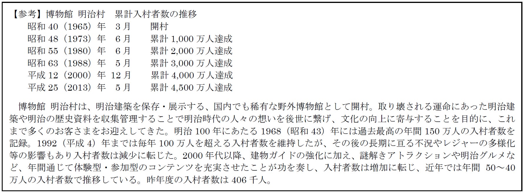 博物館 明治村(犬山市内山1番地、理事長:山本 亜土)は、1965(昭和40)年に開村以来の累計入村者数が、まもなく5,000万人に到達する見込みとなりましたのでお知らせします。