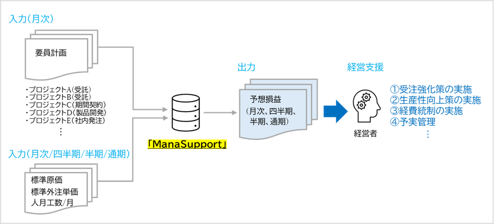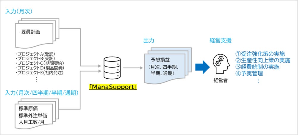 「ManaSupport」は、必要最小限のインプット情報から想定される業績や利益の見通しを把握し、経営判断をサポートする予想損益シミュレーションツールです。
