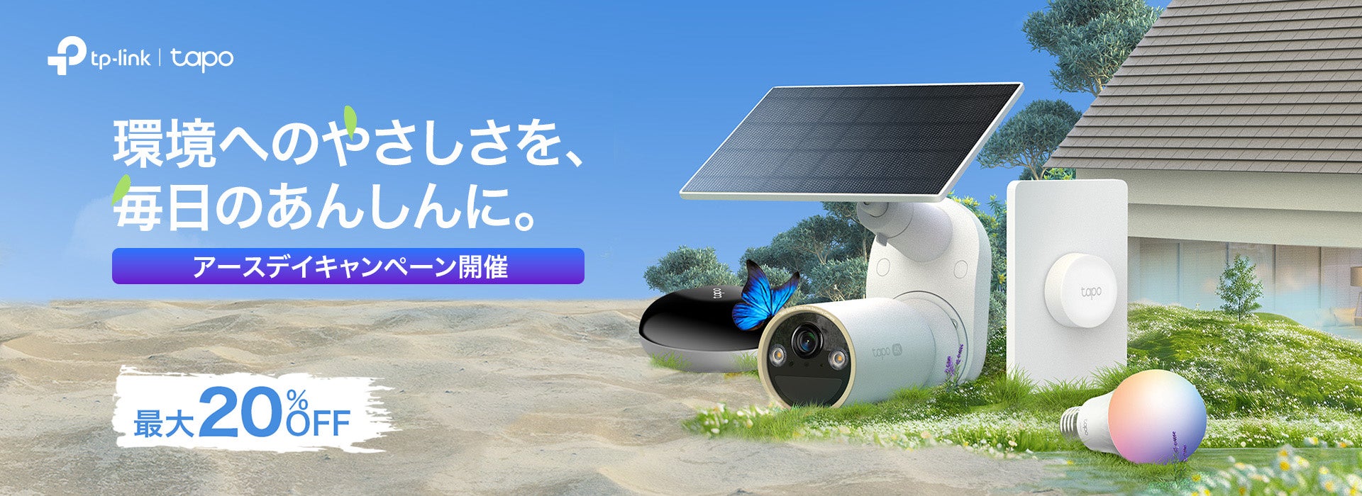 本キャンペーンは、4月22日(火)に1日限定でAmazon.co.jp・楽天市場・Yahoo!ショッピングのTP-Link公式ストアにて開催され、環境にやさしいTapoスマートホーム製品を最大20%OFFでお得にご購入いただける機会です。太陽光で稼働するソーラーパネル付きセキュリティカメラをはじめ、外出先から家電の操作が可能なスマートリモコン、室内環境の見える化をサポートするスマートセンサー、省電力設計のスマートランプやスマートプラグなど、エネルギー効率の向上にスマートな選択肢としてぴったりなラインナップが揃っています。