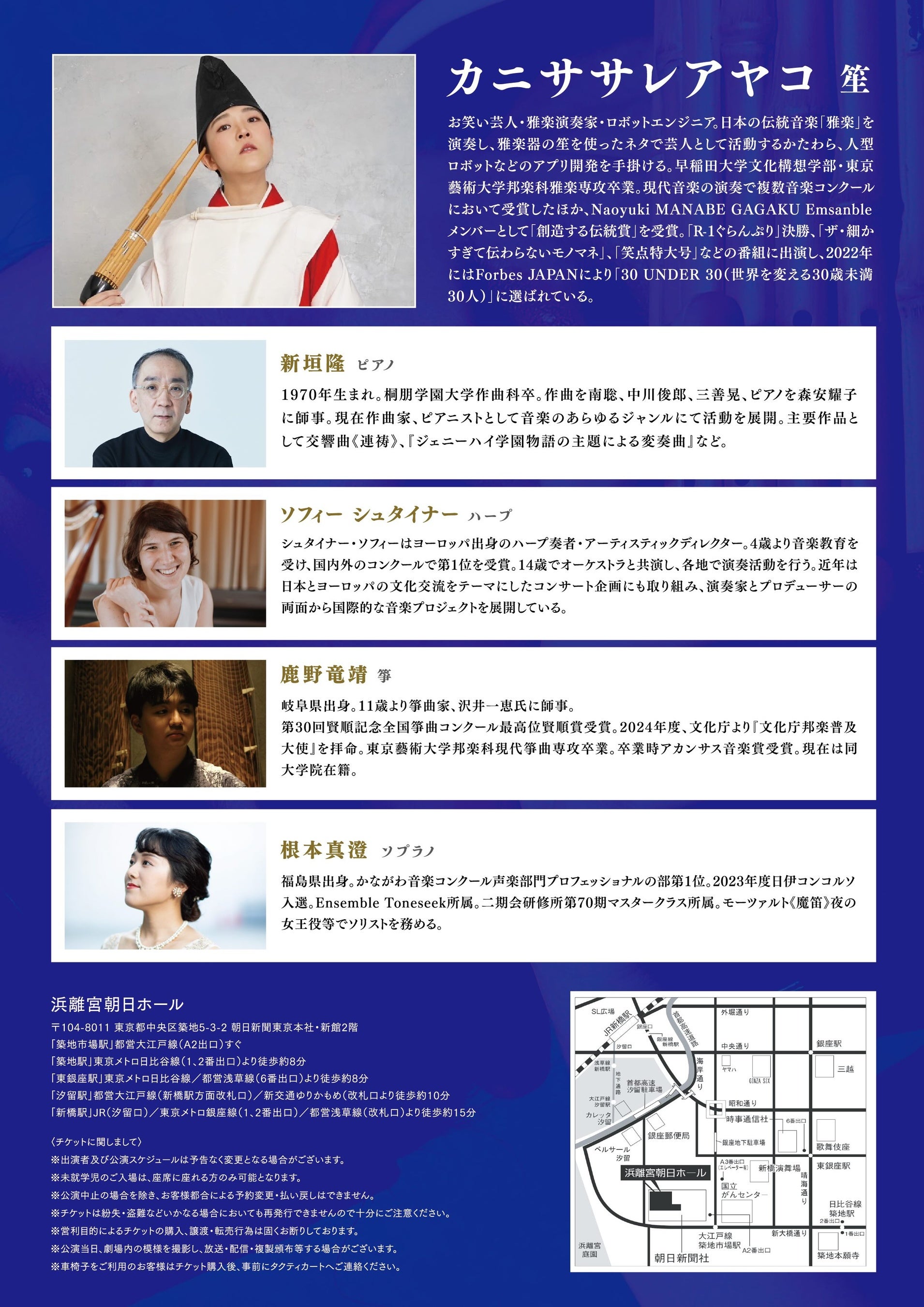 カニササレアヤコ(笙・竽)、新垣隆(ピアノ)、ソフィー・シュタイナー(ハープ)、鹿野竜靖(箏)、根本真澄(ソプラノ)
