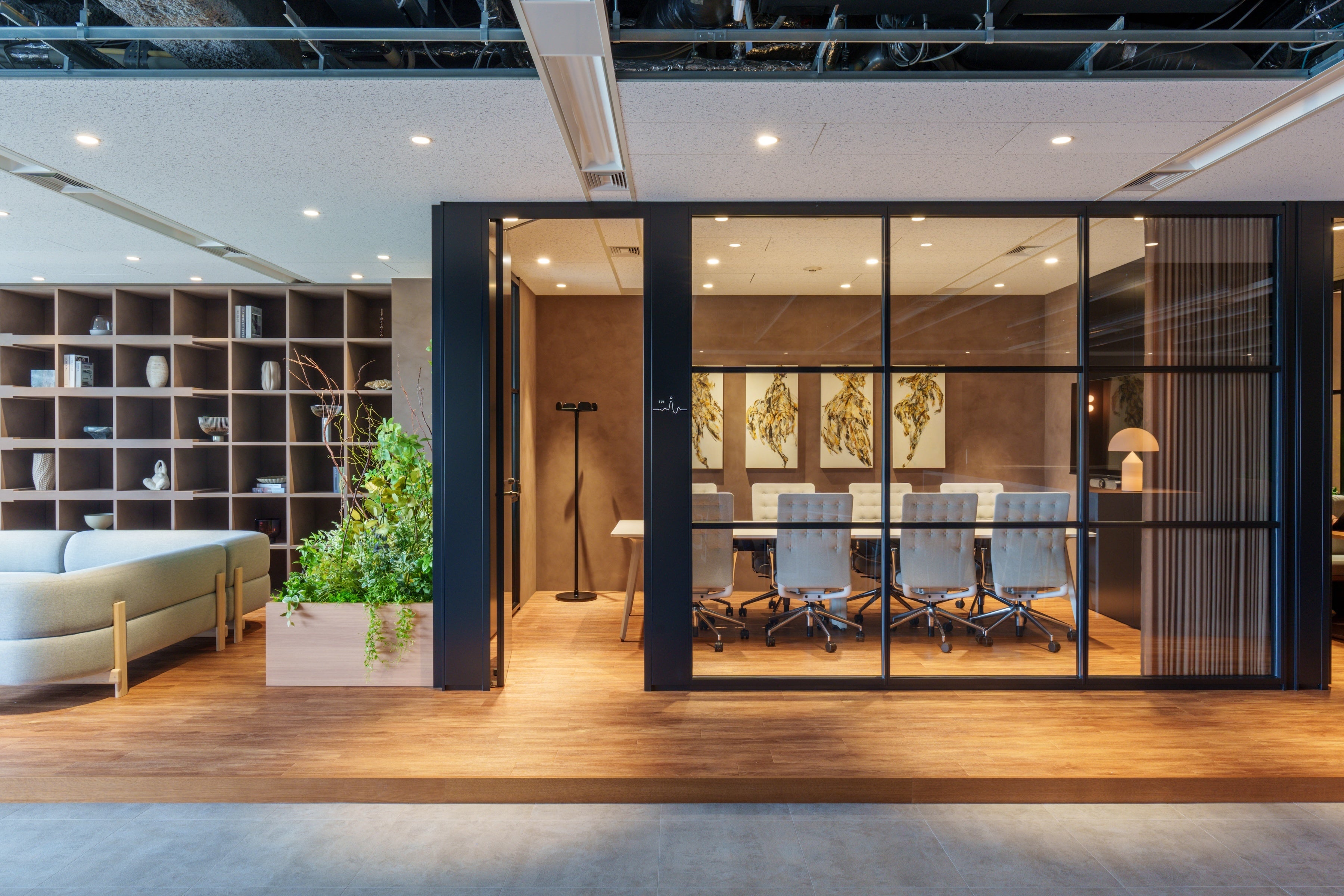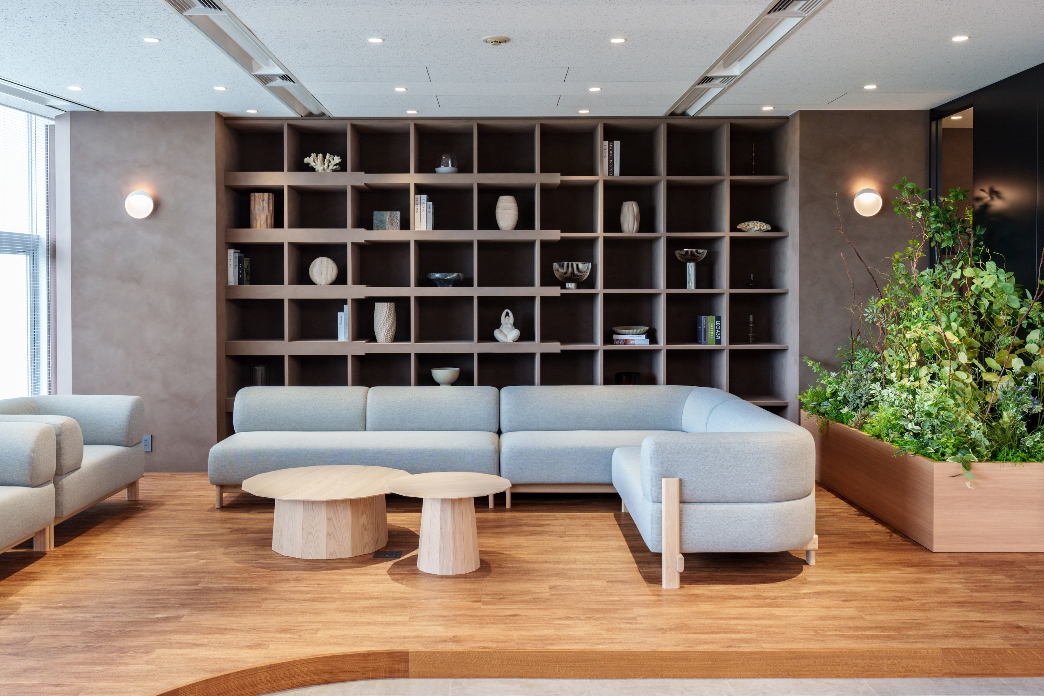 ワンフロアからなる空間で、社員やここに集う人々の間でオープンで活発なコミュニケーションが生まれることを期待して、仕切りや壁をできるだけ無くした設計となっています。床や壁、インテリアは当社のコーポレートブランドカラーを意識した落ち着いた色調で統一しており、観葉植物等グリーンも多く取り入れています。