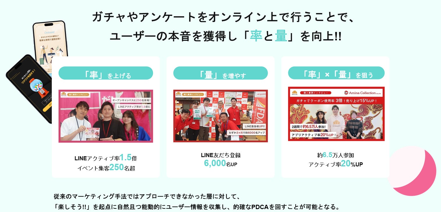 オンラインガチャ・診断アプリが誰でも簡単に作れる「クロワッサン」は2026年度までに1,000社の導入を目指しております。