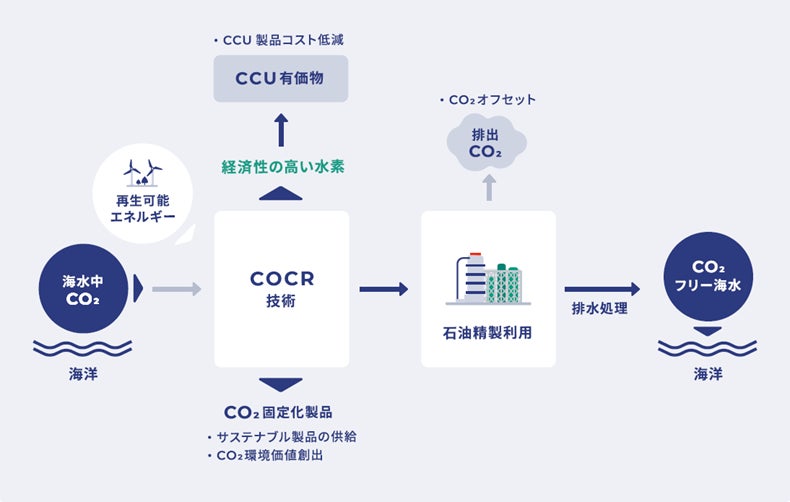 静岡大学は、電気化学を応用し、海水中に溶解しているミネラル分によりCO2を固定化するとともに、海水の電気分解により水素を製造するCarbon dioxide Ocean Capture and Reuse(COCR)技術を開発、特許を有しています。この技術を活用することで、グリーン水素製造プロセスにおいてCO2から有価物の製造・販売を検討することができます。これにより、グリーン水素製造工程での固定費の削減を図ることができ、既存グリーン水素に比べ経済性の高いグリーン水素製造を行うことが可能になります。