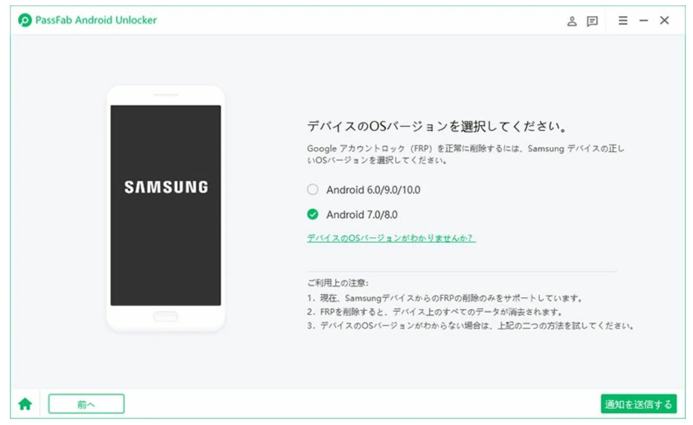 Step2:Androidデバイスをパソコンに接続し、デバイスのOSを選択して「通知を送信する」をクリックします。