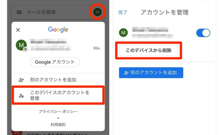 Step2:「このデバイスのアカウント管理」をタップし、「このデバイスから削除」をタップしてアカウントを削除します。