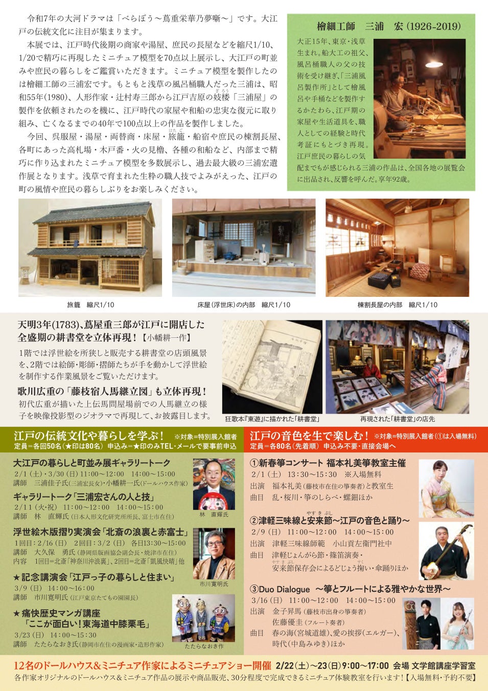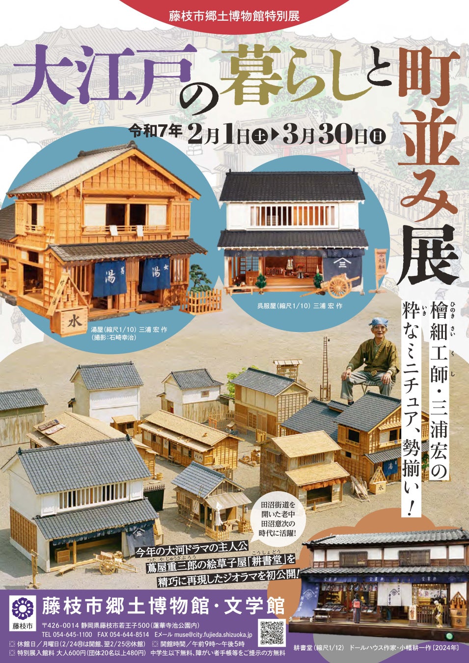 江戸の町並みや建造物のミニチュアを約40年にわたり制作した浅草の檜細工師・三浦宏さん(1926-2019)のミニチュア模型70点以上を展示し、江戸時代後期の商家や湯屋などの様子を再現します。併せて、本展のために製作した、大河ドラマ「べらぼう」の主人公・蔦屋重三郎の絵草子店「耕書堂」の再現ジオラマをお披露目します。