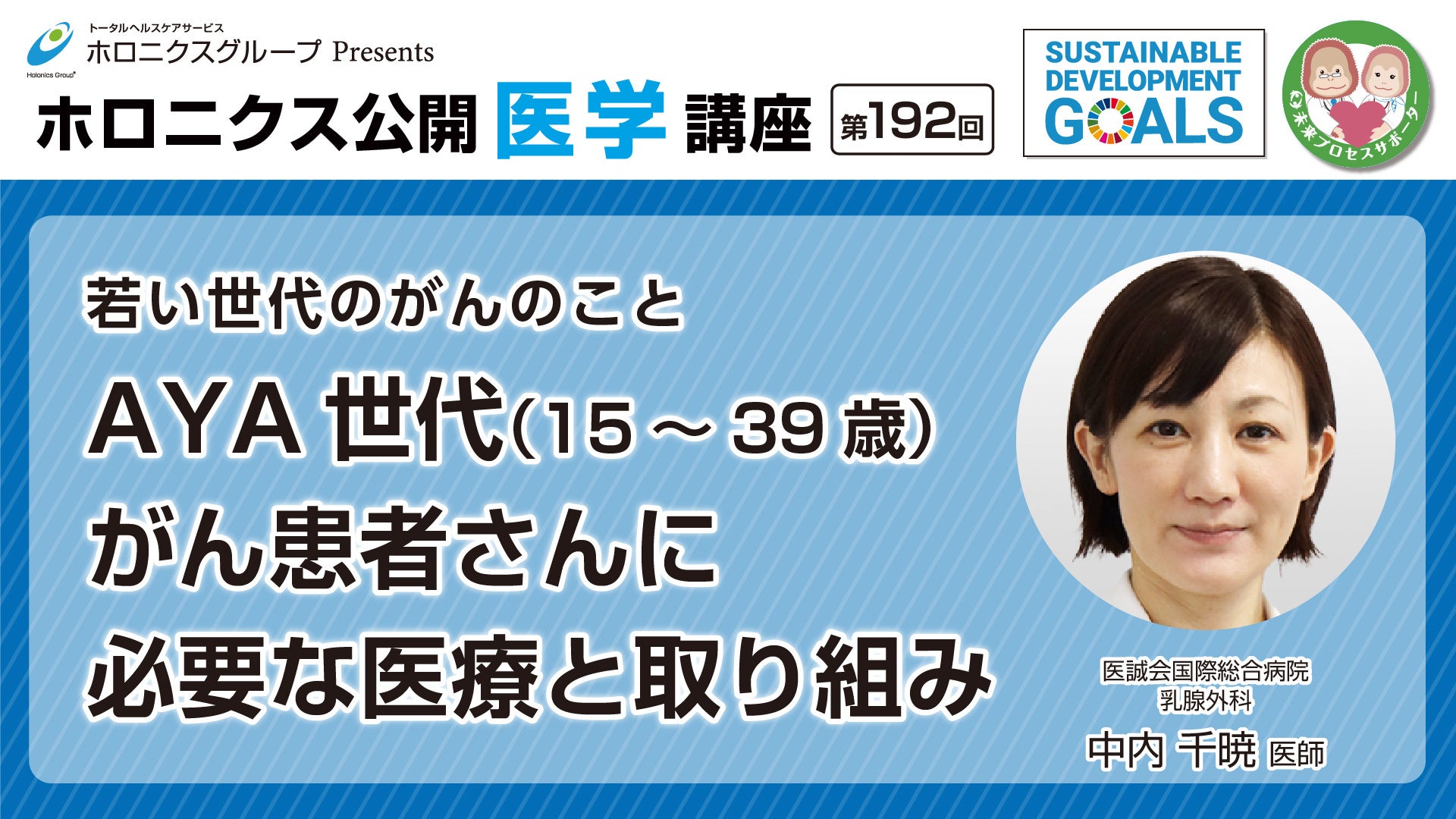 『若い世代のがんのことAYA世代(15~ 39 歳)がん患者さんに必要な医療と取り組み』/第192回ホロニクス公開医学講座 動画配信