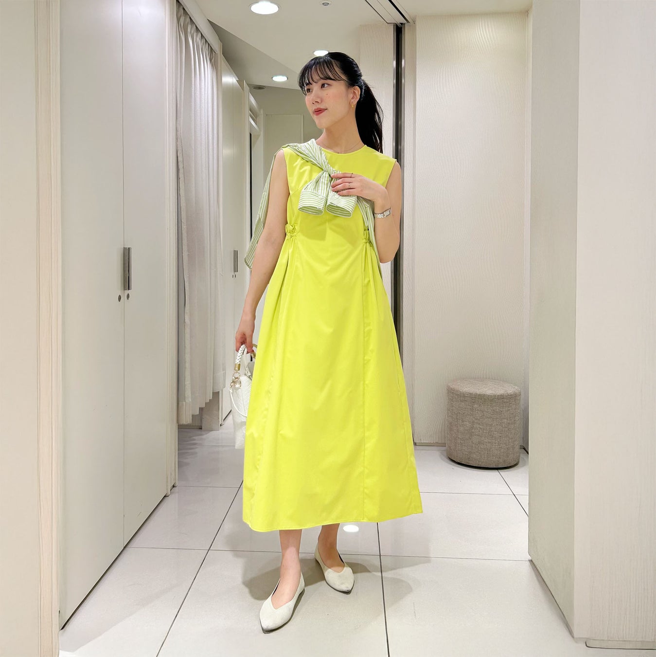 ●ウエストを高めに設定し、サイドのギャザーがデザインポイントに。