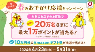 本キャンペーンの参加にはキャンペーンサイトからエントリーが必要で、対象のお店にてdポイントを期間中合計5ポイント以上ためていただくと抽選※4※5で1等1万ポイント(1,000名さま)、2等1,000ポイント(10,000名さま)、3等10ポイント(189,000名さま)を進呈いたします。さらにはじめて※6の店舗でdポイントをためていただくと、当選確率が5倍にアップします。また、dポイントクラブ公式Xアカウントをフォローした上で対象のポストをリポストいただくと、抽選※7※8で10名さまにAmazonギフト券10万円分があたるキャンペーン※9※10を2024年4月23日(火)から2024年4月29日(月)までの期間で開催いたします。キャンペーン詳細はキャンペーンサイトにてご確認ください。