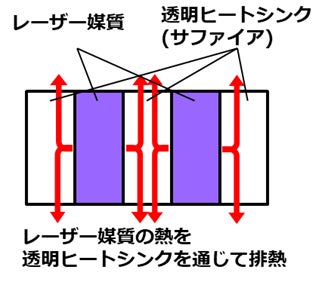 ・レーザー装置の高出力化を妨げるレーザー媒質(※3)の発熱への対策として、レーザー媒質と、冷却の役割を担う透明ヒートシンクであるサファイアを交互に接合するDistributed Face Coolingの技術を理化学研究所および分子科学研究所との連携により開発