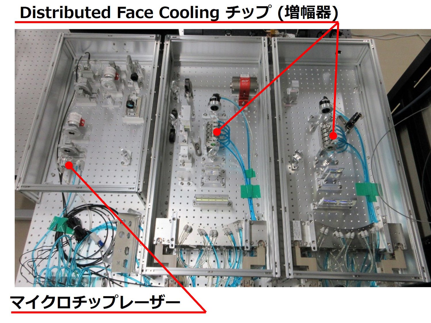 ・当技術を採用した高排熱チップによりレーザー光を増幅することで、従来、低温冷却が必要だったジュール級の高出力レーザーの常温での動作が可能。低温冷却装置が不要となり、レーザー装置を約1.0m×1.2mまで小型化。また、出力が同等の装置と比較して2倍の速さでのパルス出力も実現し、レーザー加速技術の高度化に貢献