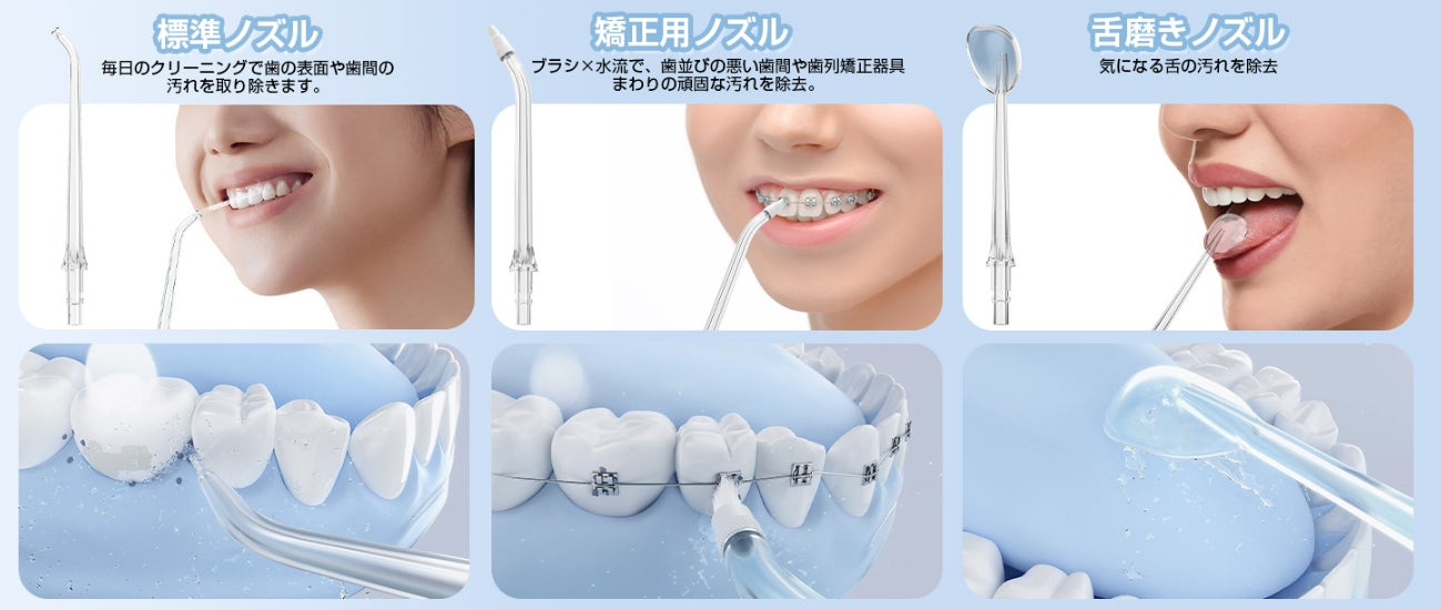 この口腔洗浄器には、通常のノズルに加えて、舌用や矯正用の特別なノズルが付属しています。特に矯正中の方には矯正用ノズルが便利で、ワイヤーに挟まった食べかすや汚れをしっかり除去できます。用途に合わせてノズルを使い分けることで、全体的に口内を効果的に清潔に保つことができます。