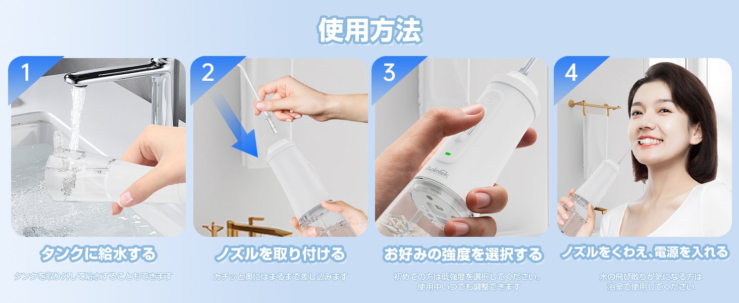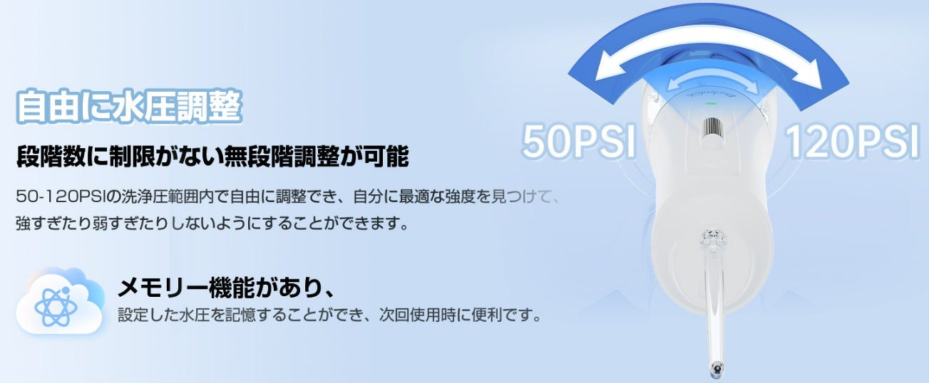 Aolmfekのジェットウォッシャーは、無段階で水圧を調整できるため、自分の好みにぴったり合わせて使用可能。最大水圧で歯の汚れを99.9%除去でき、日々の口腔ケアがさらに効果的に。実際に使用したユーザーからは「水圧調整が簡単で、自分にぴったりの強さが見つけられた」「ノズルが細くて使いやすく、口内での動かしやすさが良い」といった高評価が寄せられています。
