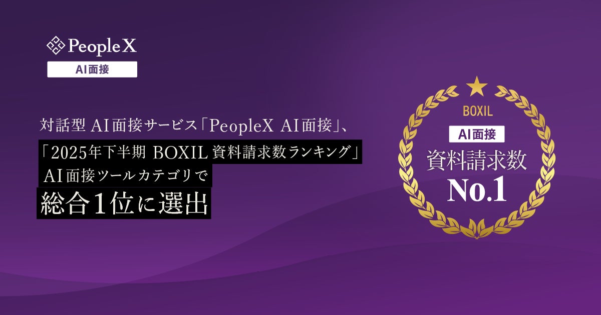 採用から活躍支援まで、AIで人事課題を解決する株式会社PeopleX(本社:東京都新宿区、代表取締役 CEO:橘 大地、以下:当社)は、当社が提供する対話型AI面接サービス「PeopleX AI面接」が、スマートキャンプ株式会社(以下:スマートキャンプ)主催の「2025年下半期 BOXIL資料請求数ランキング」のAI面接ツールカテゴリにおいて総合1位に選出されたことをお知らせいたします。