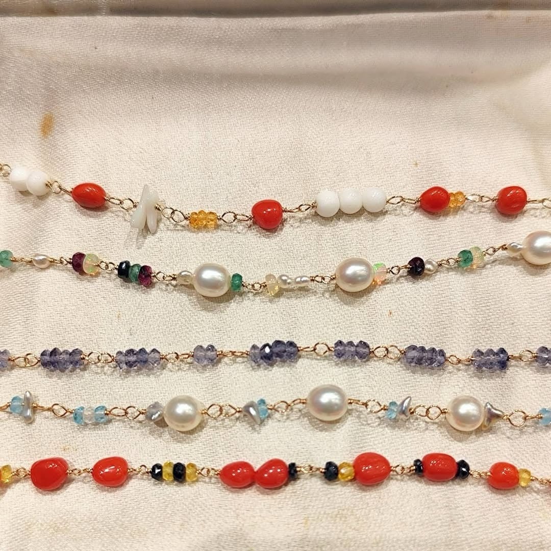 今回京都店でご紹介しているのは、サルディーニャ珊瑚や白珊瑚、スペサタイトガーネットを組み合わせた深みのある一本、透明感のあるアパタイトにアコヤ真珠のケシと淡水パール、ロイヤルブルームーンストーンを添えた幻想的な一本、そして色とりどりのサファイアやオパールをあしらった華やかな一本など、いずれも異なる素材の魅力を引き立てる個性豊かな仕上がりです。