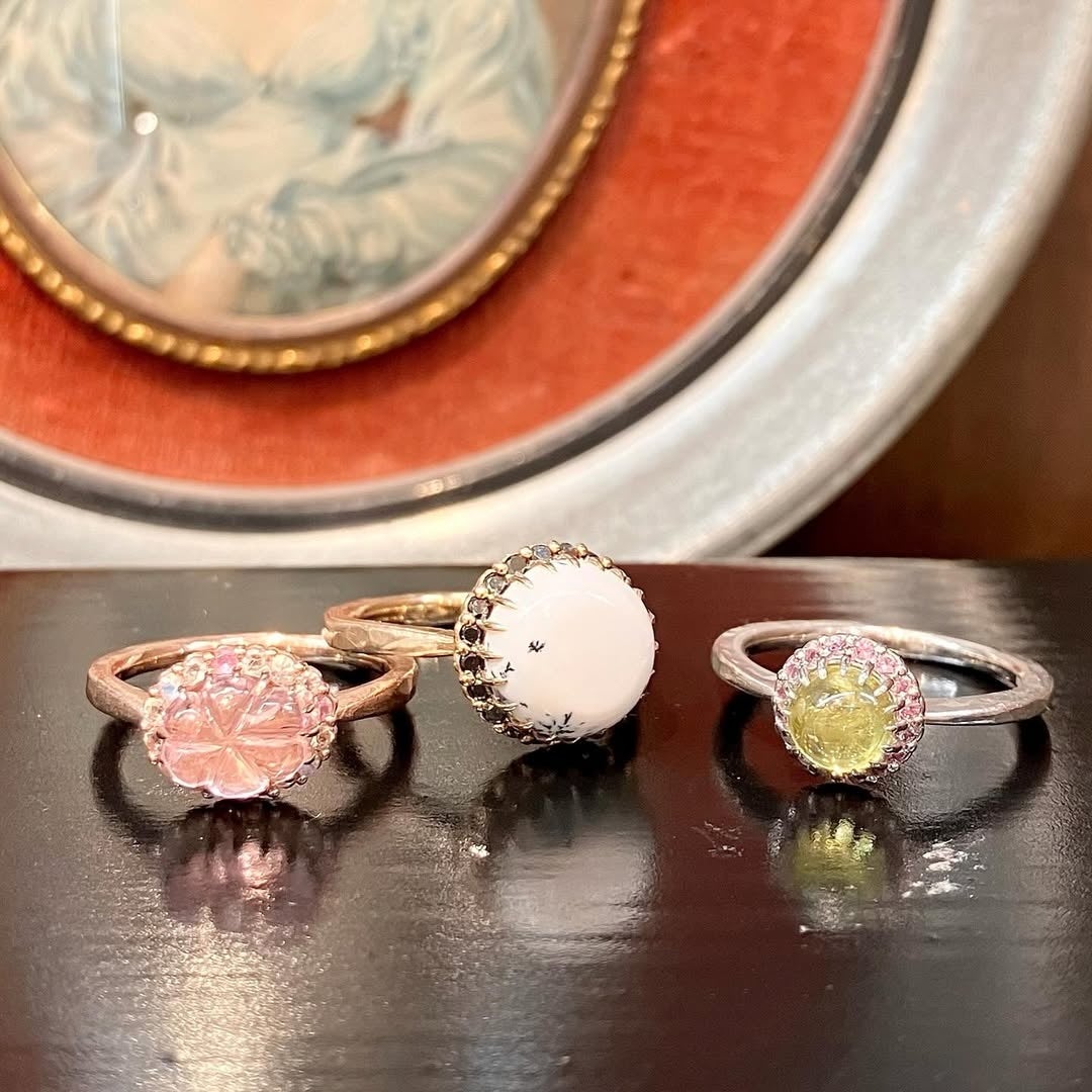 お選びいただいたルースは、そのままお持ち帰りいただくことはもちろん、その場でジュエリーオーダーのご相談も承ります。今月はリング枠の新調に伴い、シンプルなカスタム枠でのオーダーはお休みとなり、ポンポネやリーベルのデザインでのお仕立てを承ります。