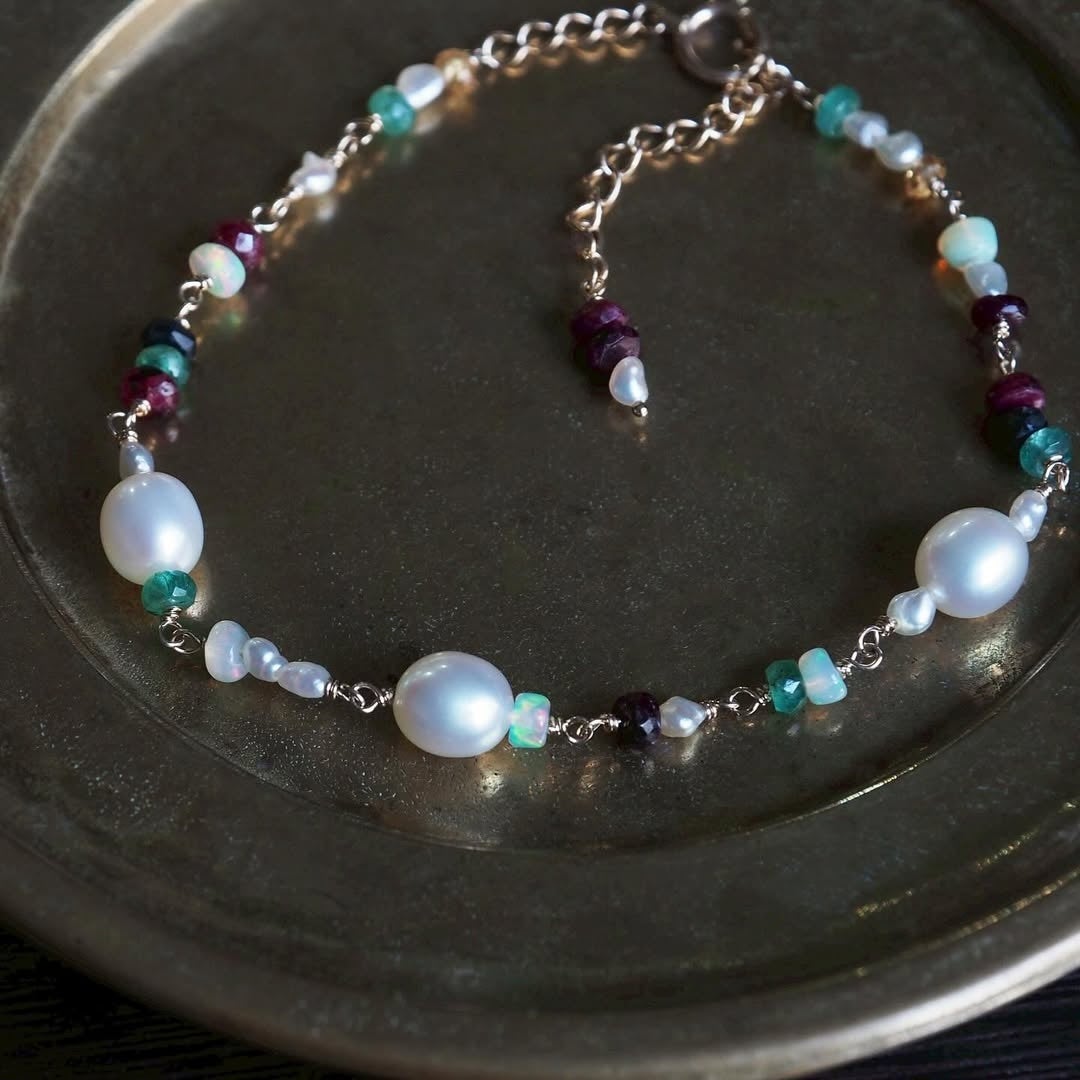 スタッフおすすめは、アパタイトとパールを組み合わせた涼やかなブレスレット。ブルーの中に月光を思わせる柔らかな輝きが、手元をふと見るたびに気分を明るくしてくれます。