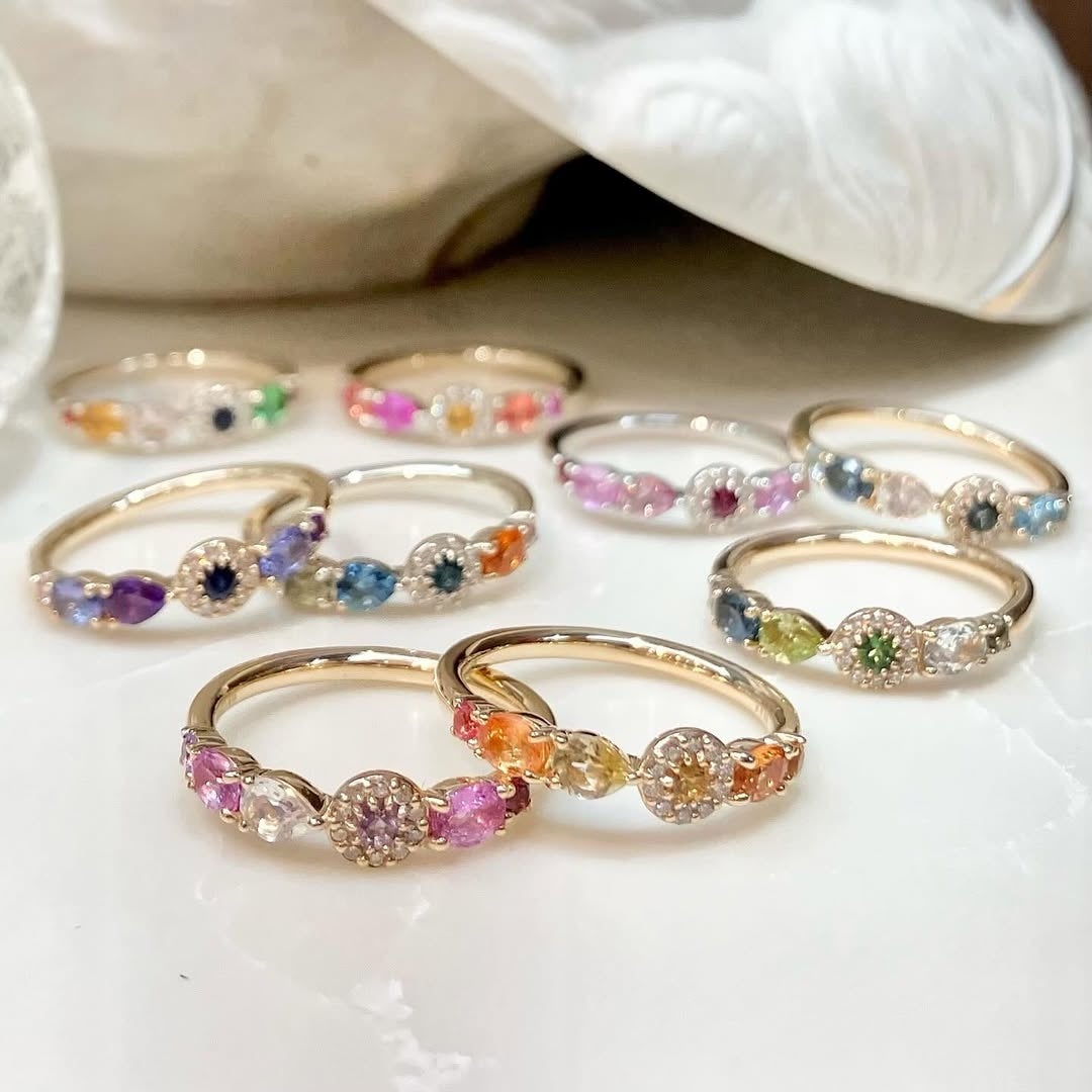 色とりどりの宝石が連なる姿は、まるで花冠のよう。ひとつひとつ異なる形や色彩が集まり、唯一無二の輝きを放ちます。今回新たに仲間入りしたのは、深みのあるオレンジ、落ち着いたブルー、やわらかなピンクなど、シックで温かみのあるカラーストーン。上品さの中に遊び心を感じさせるデザインで、装いにさりげない華やぎを添えます。ひとつひとつ配色が異なるため、自分だけのお気に入りを見つける楽しさも魅力です。