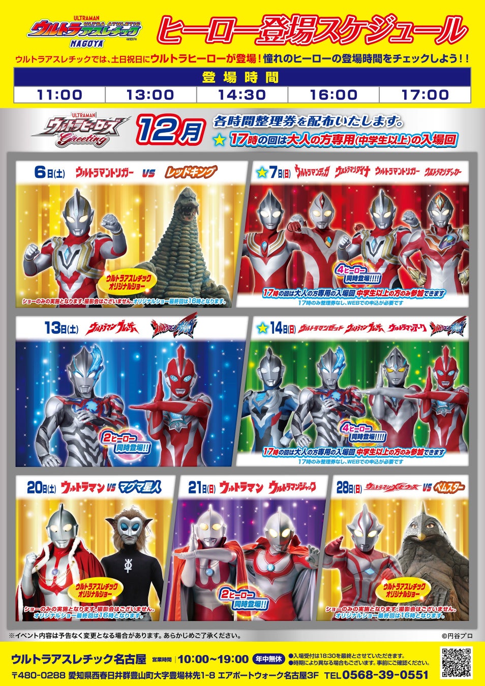 ウルトラアスレチック横浜では、4体のウルトラヒーローが登場する特別なヒーローステージを実施します。12月14日(日)は、「ウルトラマン」、「ウルトラセブン」、「ウルトラマンジャック」、「ウルトラマンエース」というレジェンドヒーローが登場。12月21日(日)は、「ウルトラマンゼロ」、「ウルトラマンエックス」、「ウルトラマンブレーザー」、「ウルトラマンオメガ」というニュージェネレーションを代表するウルトラヒーローが登場します!