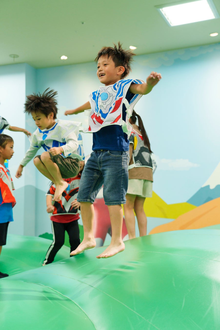 『ウルトラアスレチック』とは、トランポリンやライド、スライダー、ボールプールなどお子さまが全身を使って遊べるアスレチックが遊び放題の施設です。ウルトラマンや隊員をモチーフにしたデザインのビブスを身につけて遊べば、まるでウルトラマンや隊員になった気分になれます!グッズショップも併設しています。